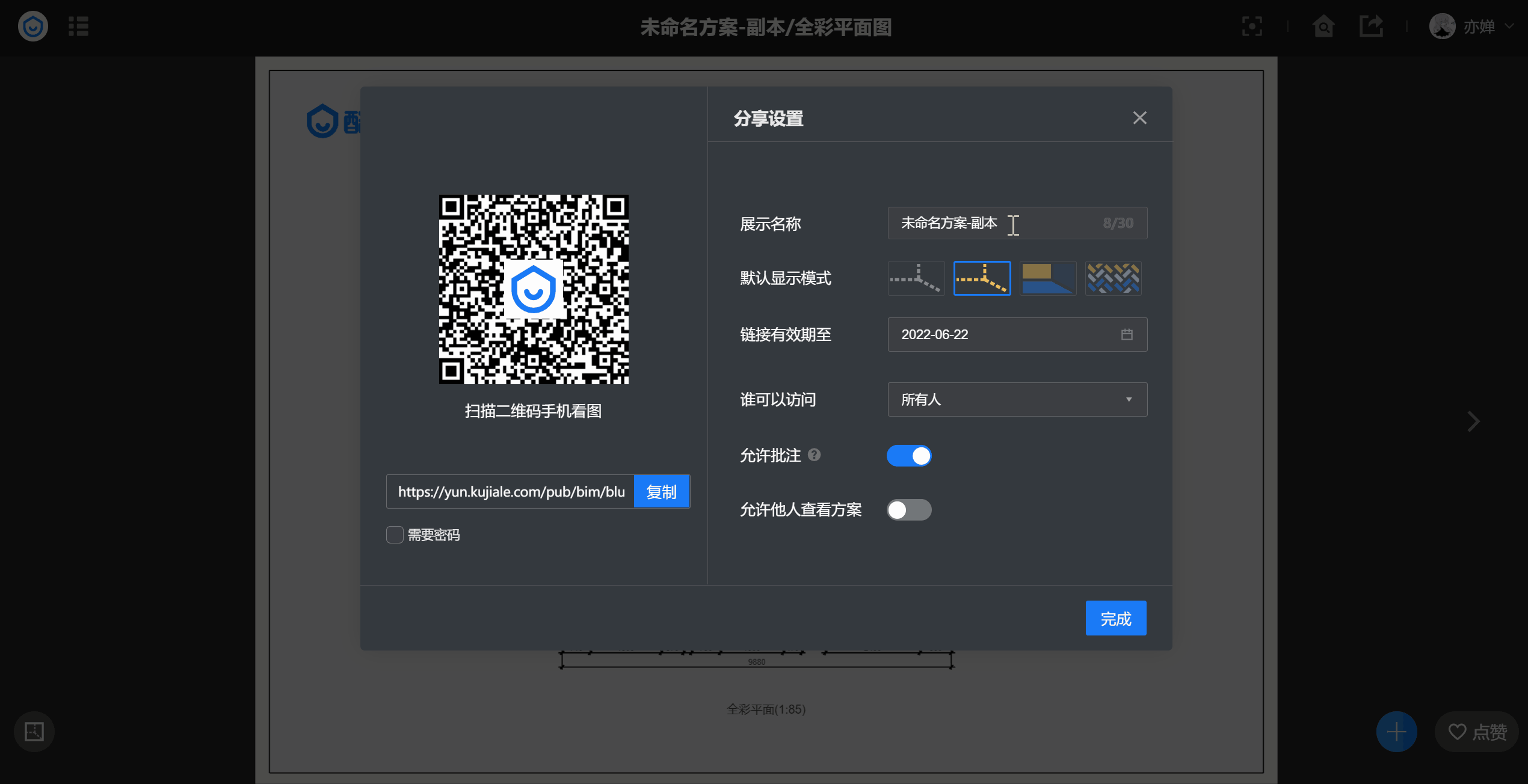 可支持设置的有:展示名称、默认显示模式、链接有效期、允许访问的人、是否允许批注、是否允许他人查看方案。