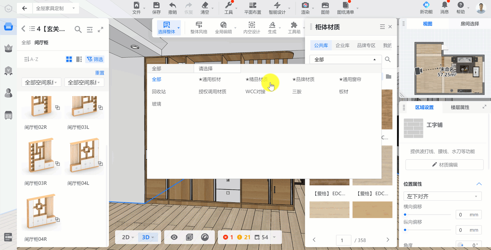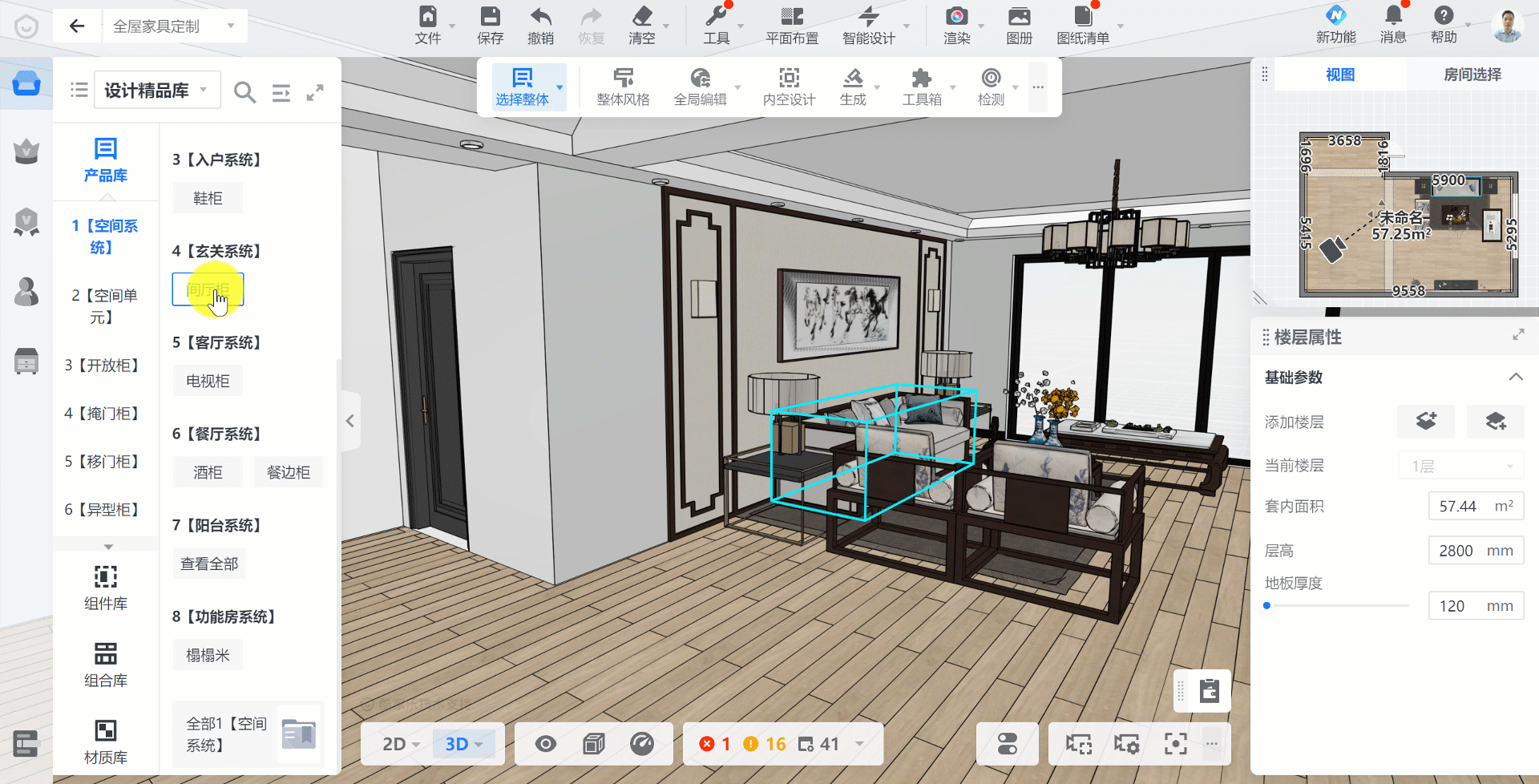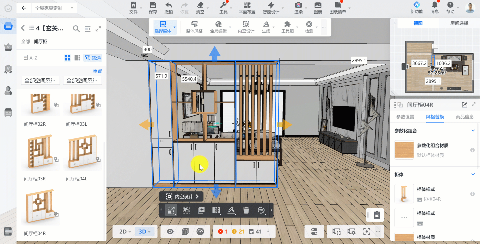 第一步:点击行业库-全屋家具定制-公共库-设计精品库-产品库-【空间设计】-【玄关系统】-间厅柜—选择喜欢的款式拖入;