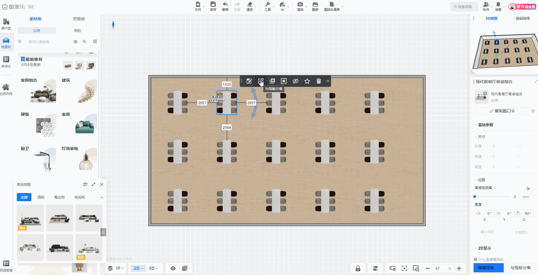 在云设计工具中,创建母版模型并进行大批量复制后,在编辑母版模式对任意模型进行缩放、翻转、替换模型、尺寸修改、材质替换等操作,其它模型均会一起变动,实现高效编辑,提升工作效率,适用场景如下: