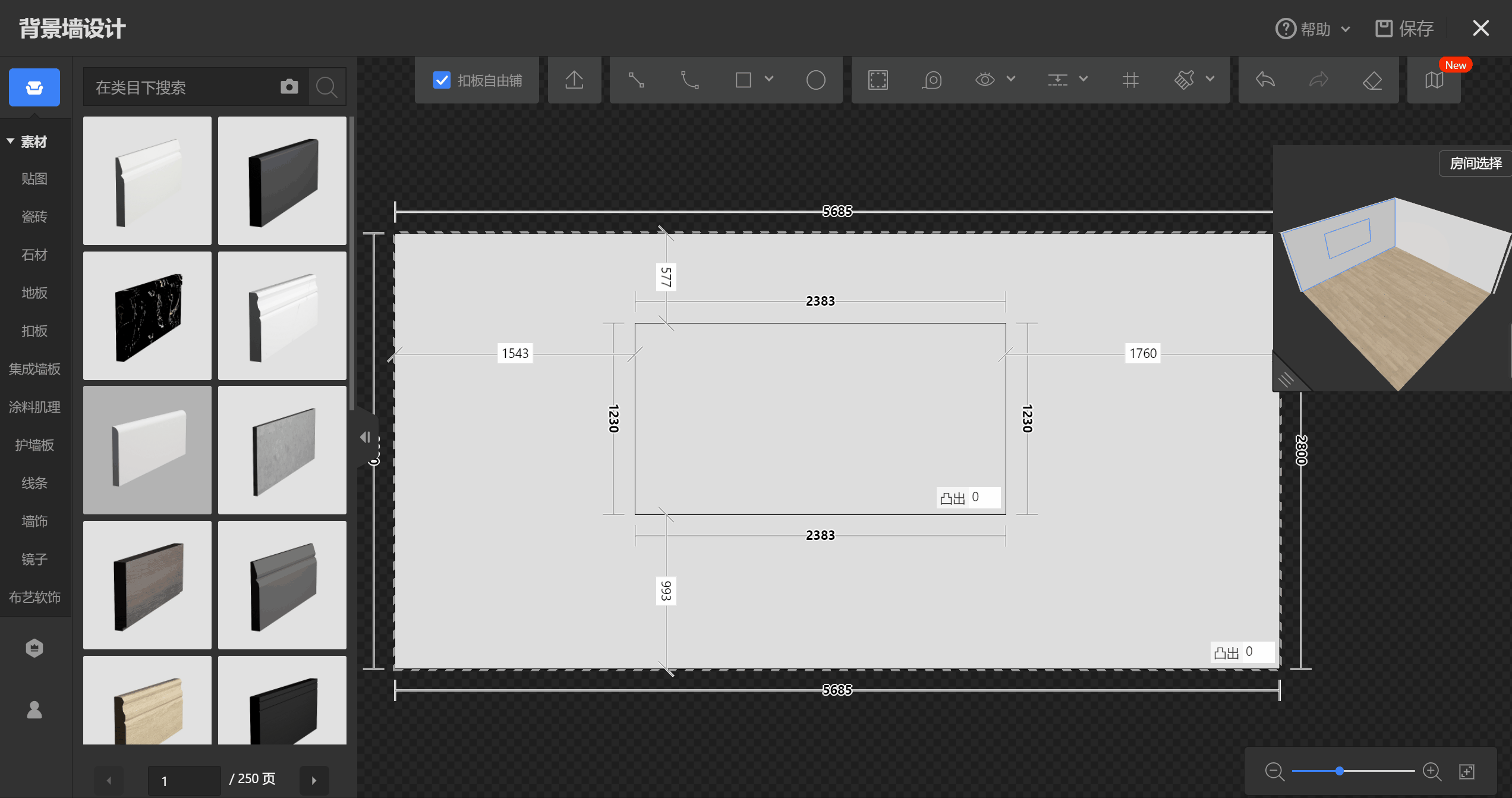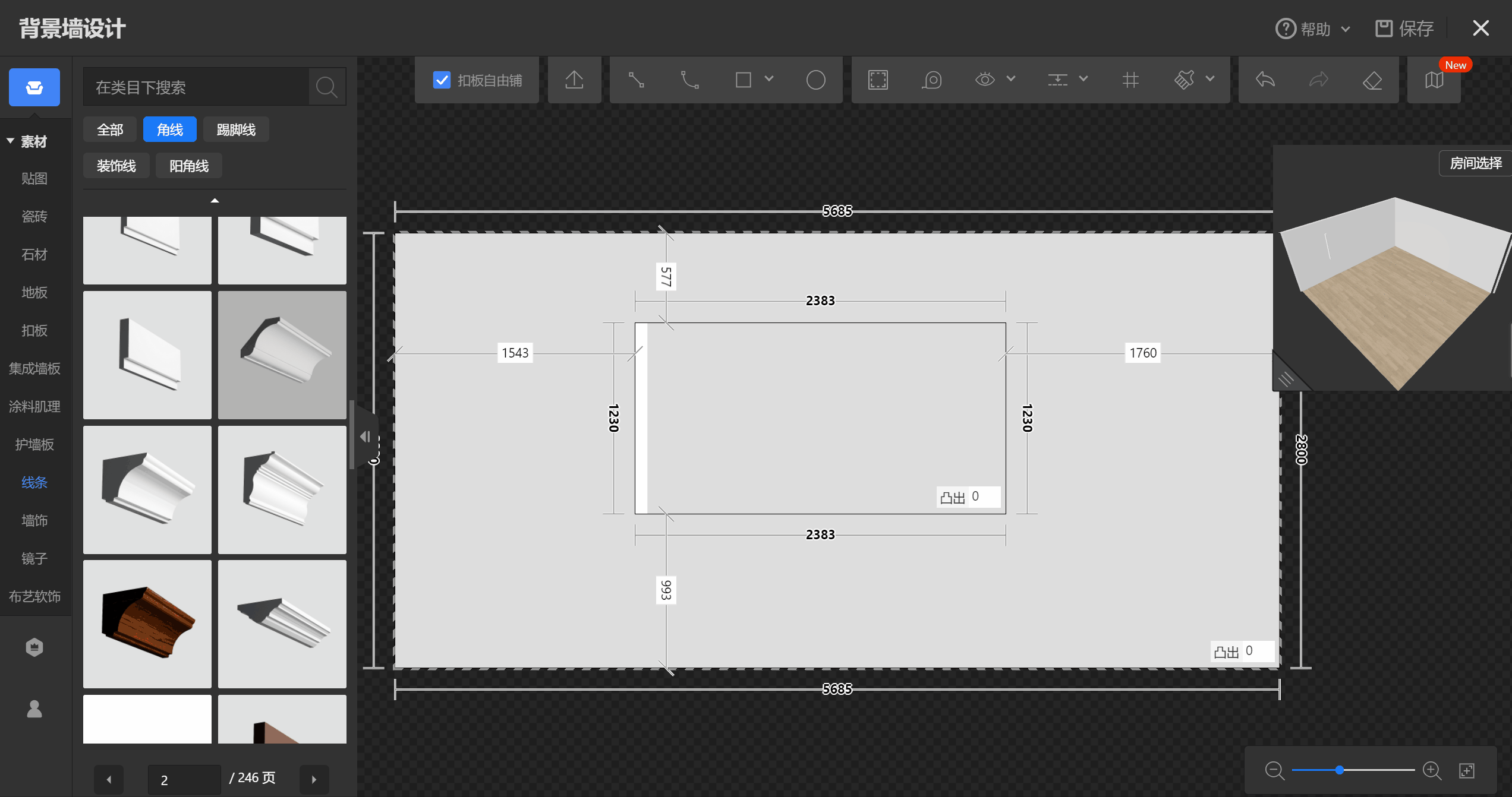 1、画好一个矩形造型面后,左侧素材栏里鼠标左键点击一种样式的角线,然后键盘按住ctrl按键,把角线拖到你想放置的造型线上