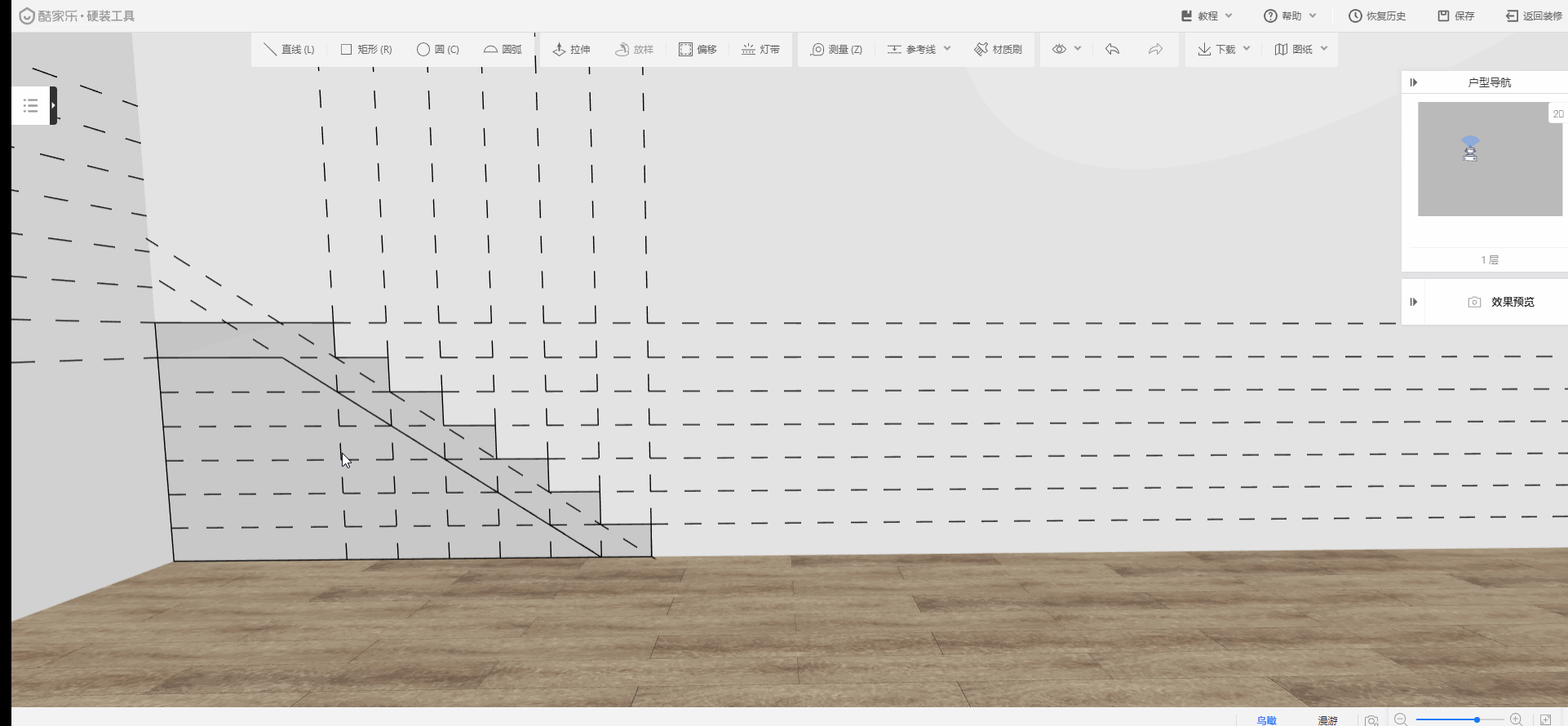 在硬装工具里有两种方法画楼梯:自由造型画楼梯和背景墙设计画楼梯