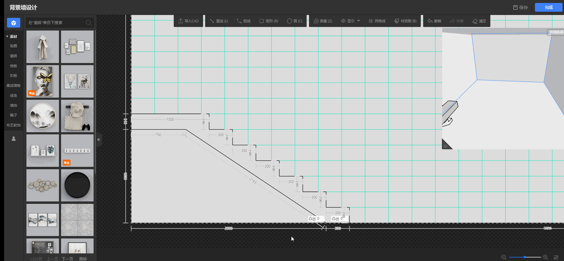 1、从云设计左侧工具栏找到行业库点开找到全屋硬装工具点击进入,来到硬装工具的3D场景界面后,选择一面墙点击后进入到背景墙设计(或者从云设计中直接选定一面墙,点击进入背景墙设计)