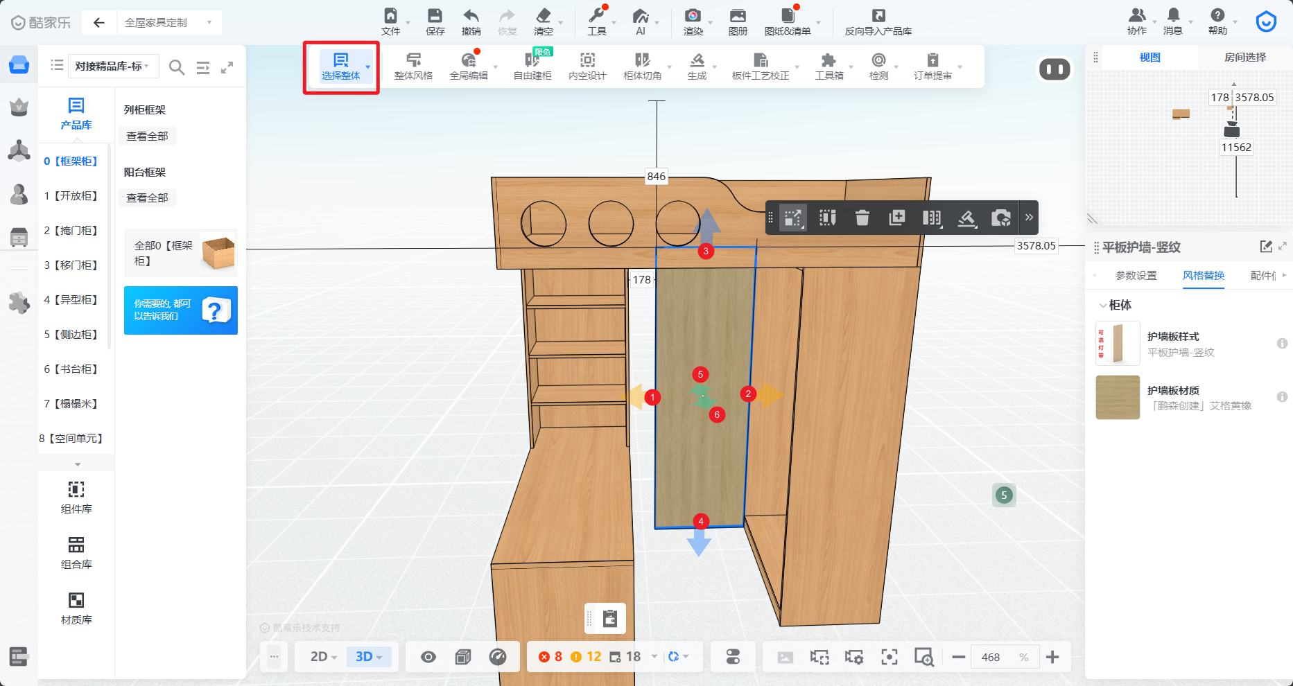 第一步:进入定制工具线,在“选择整体”模式下,选中柜体单元,即可看到6个向外的箭头