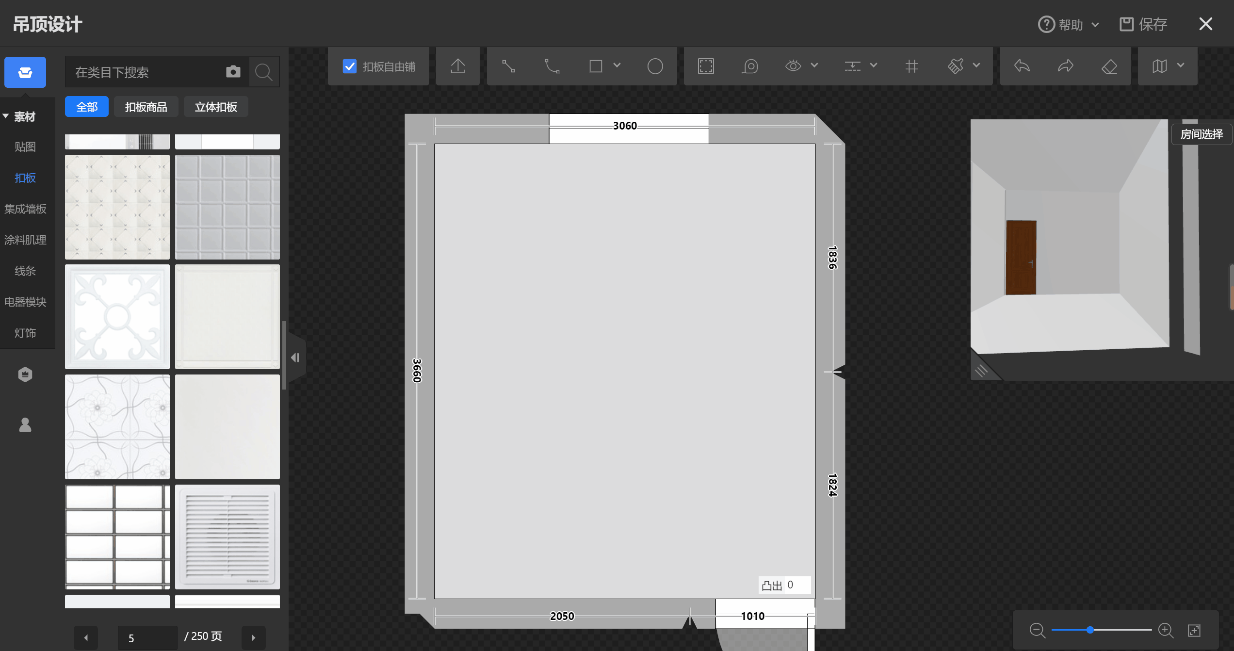 满足用户在吊顶设计界面中使用扣板自由铺可做出多种铺法。
