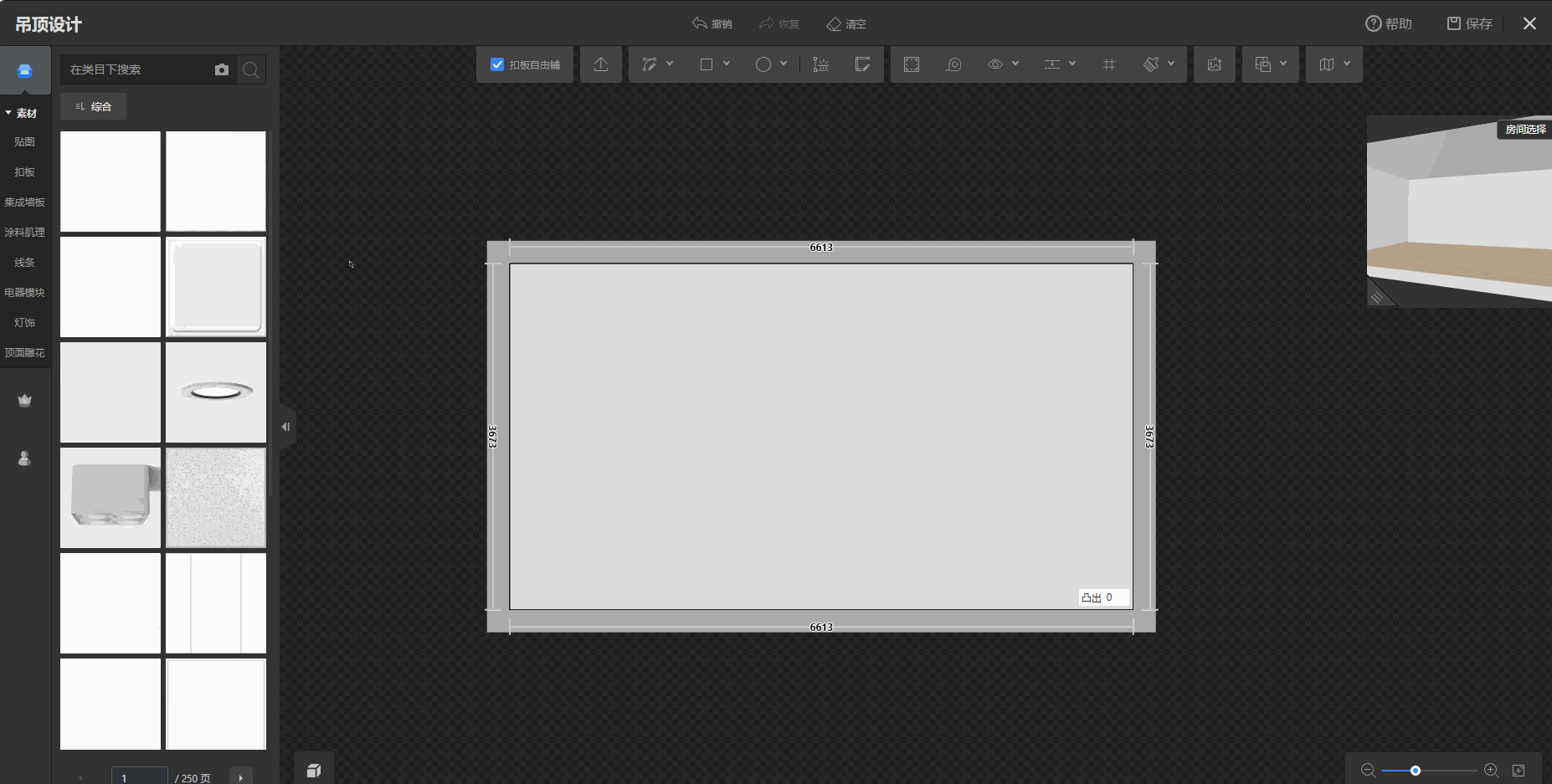 第三步:勾选扣板自由铺时,点击凸出面的边,进入立面编辑页面,然后在左侧素材库点击合适的扣板素材,拖动放置立面,此时为单独放置效果