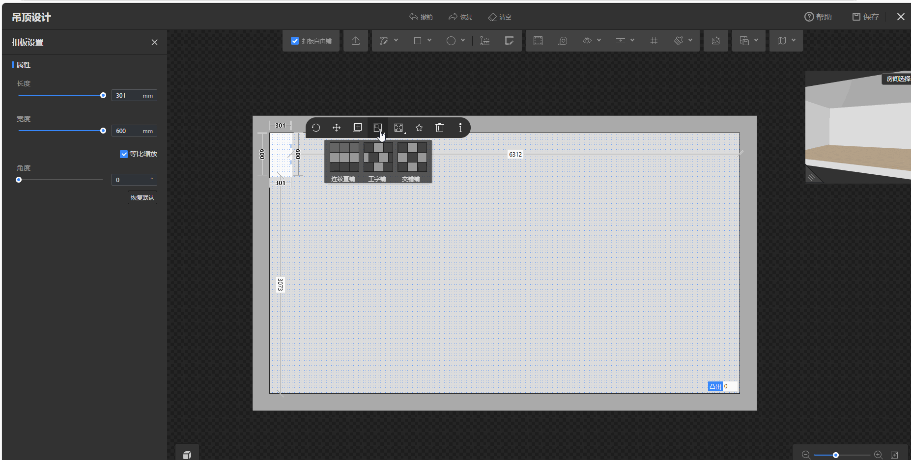 勾选扣板自由铺模式下,在顶面放置了单块素材,此时选中素材,点击浮窗中的满铺,然后选择需要的铺法(连续直铺/工字铺/交错铺)一键应用即可