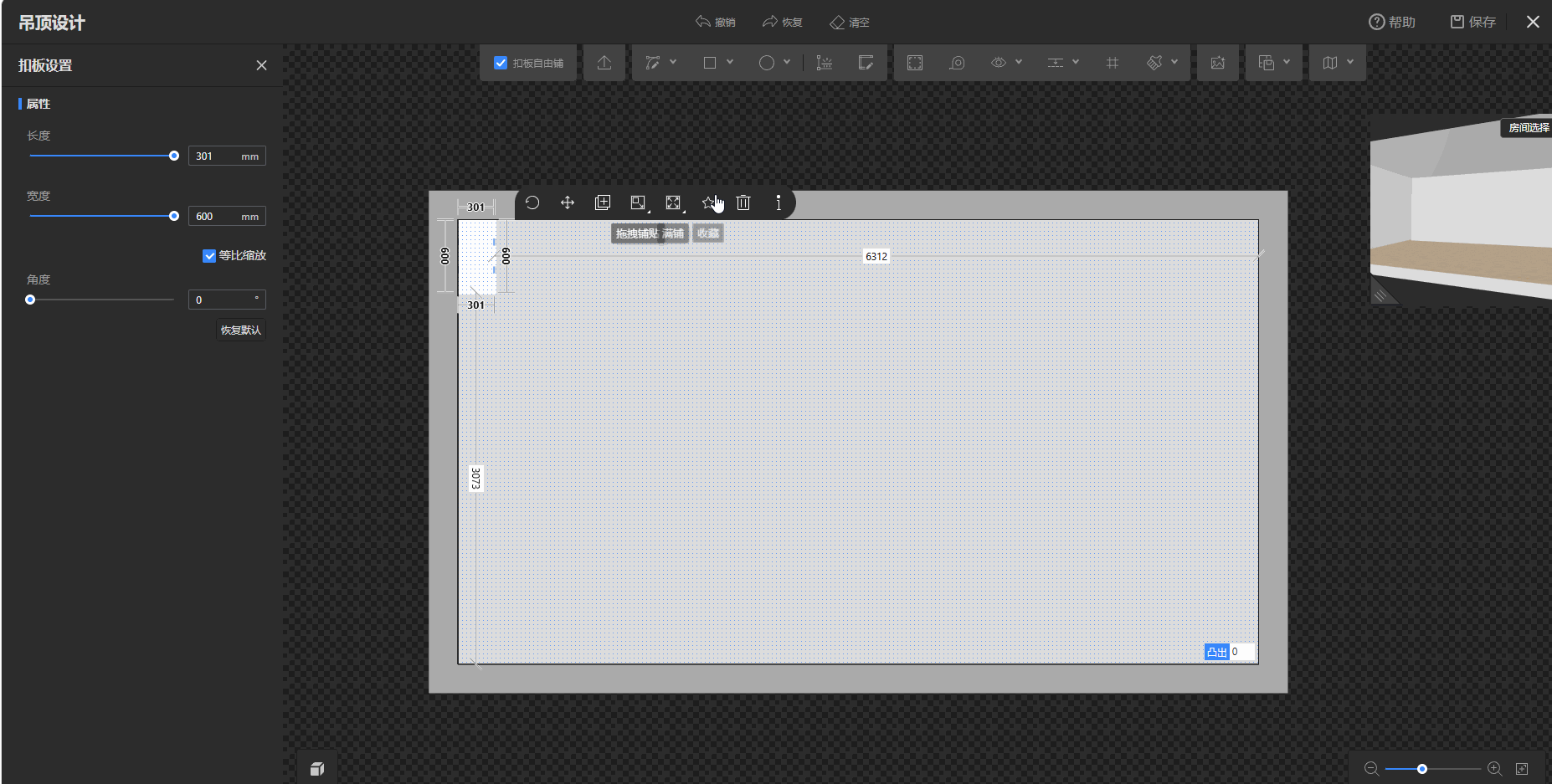 - 选择已放置的扣板,根据需要点击浮窗中的工具进行设置(如旋转、移动、复制、拖拽铺贴(连续直铺、工字铺、交错铺)、满铺(连续直铺、工字铺、交错铺)、收藏、删除等)