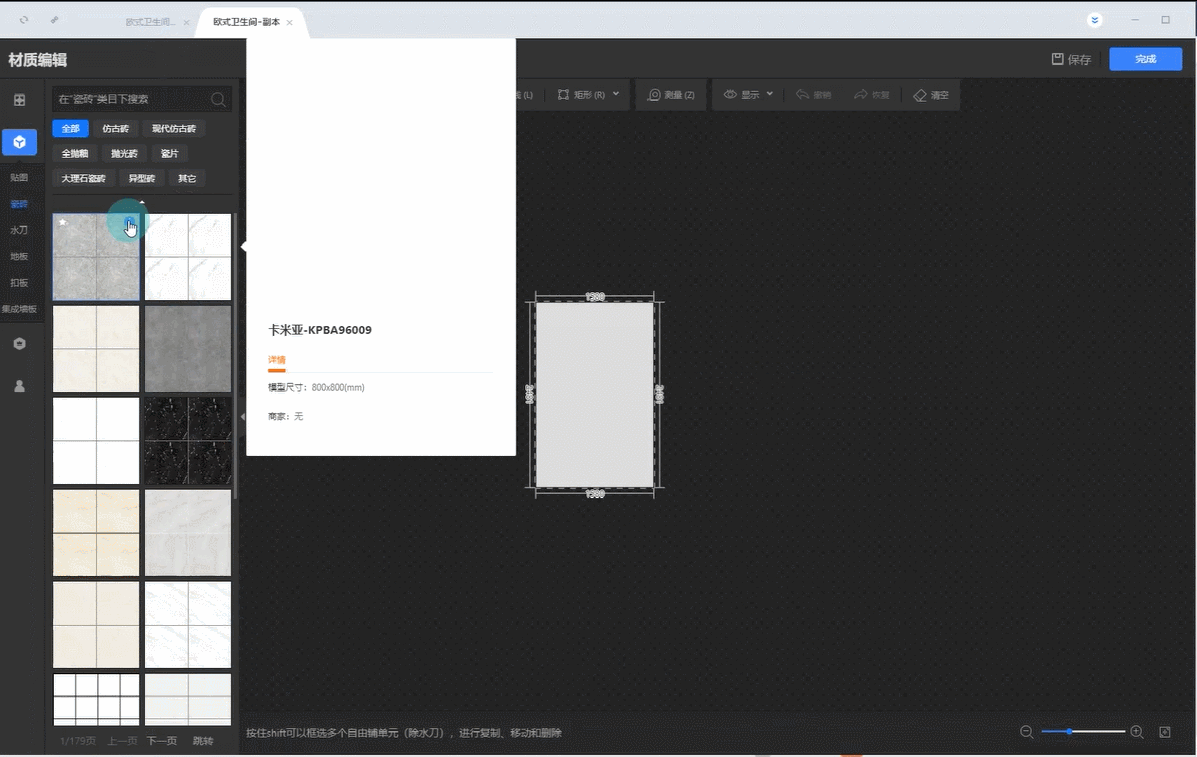 11.左侧素材库中选择一款瓷砖,放置地面区域。