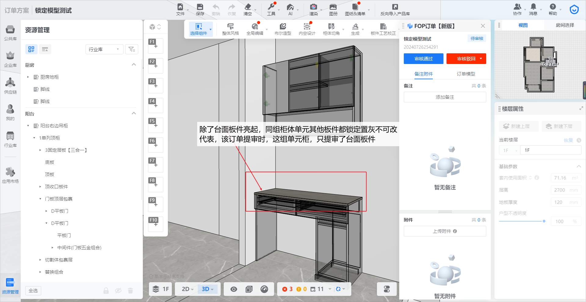 4)审拆员进入订单方案,部分组件模型被锁定不可改,部分板件亮起可改,代表设计师仅提审了部分板件,未被提审的板件置灰锁定不可改