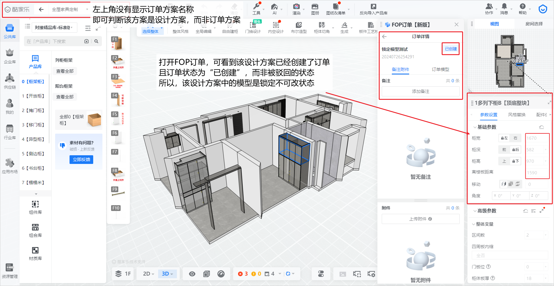 一般订单状态为 “已创建”/“待审核”/“已拆单” 状态下的设计方案,设计方案内的模型都是置灰不可改的状态