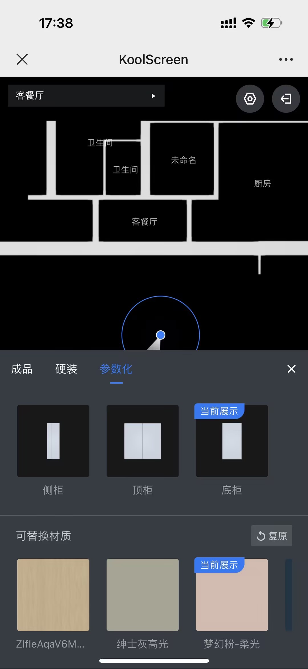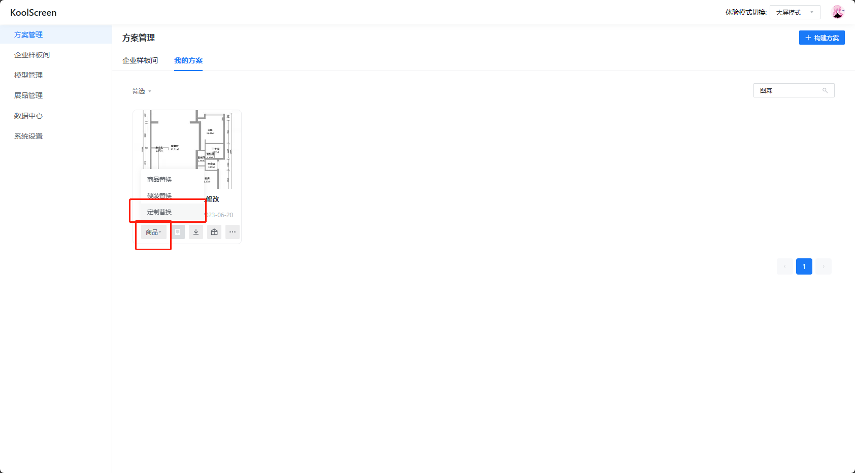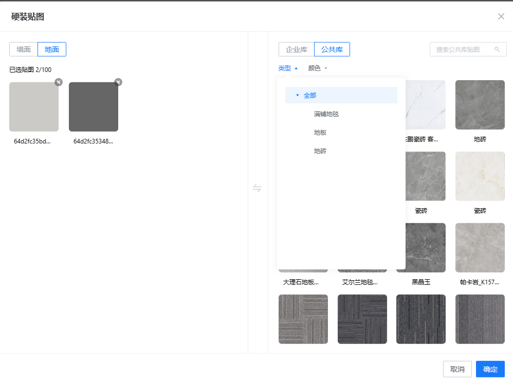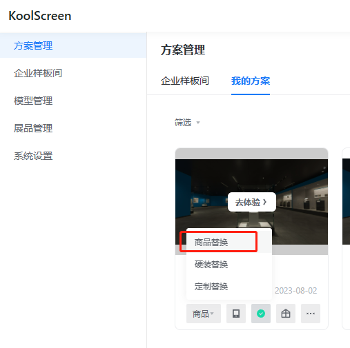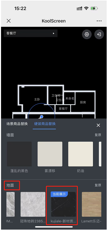 - 进入方案,在控制端选择【商品-硬装替换】,选择地面或地面,进行替换