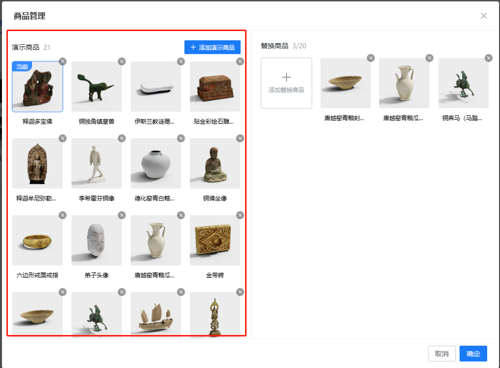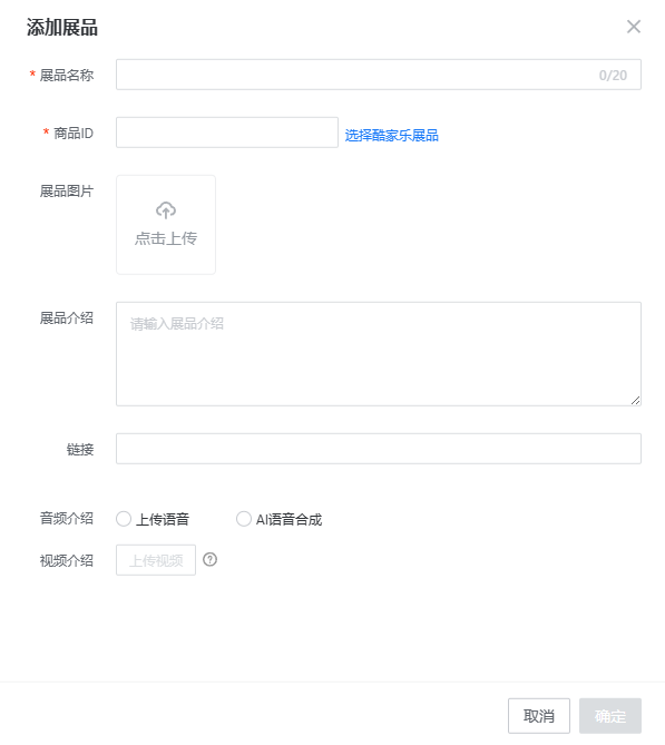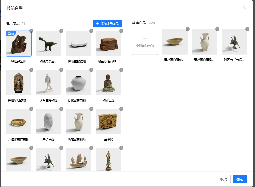 - 支持展品名称、展品图片(3张)、展品文字介绍、展品购买链接、展品语音介绍、展品视频