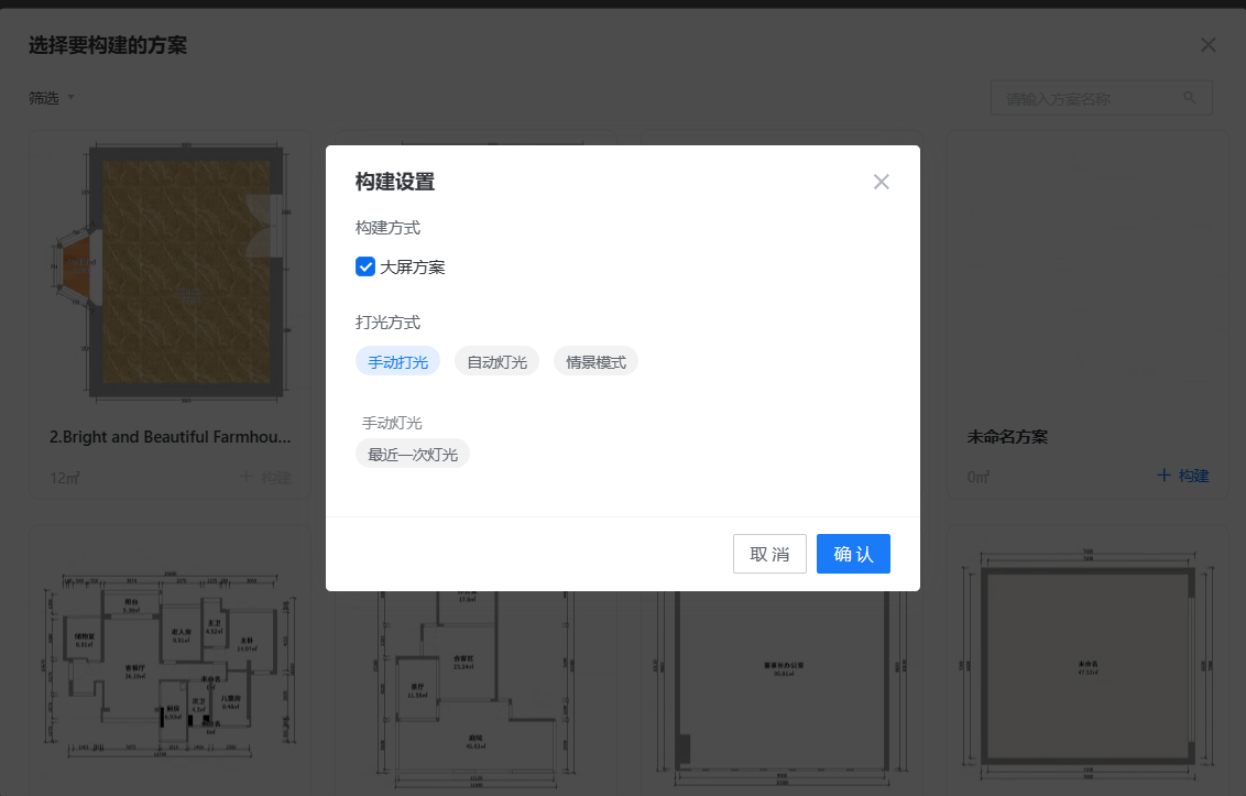- 构建时,可以选择是云图自动灯光(酷家乐自动灯光3.0)、酷家乐用户手动灯光模板、koolight情景模式灯光