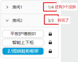 当所有柜组都完成拆单后,需注意查看房间名称栏里的前后数字是否是相等,若前后数字不相等,则代表有模型没有被拆单保存,需要注意将未拆单模型拆单保存;