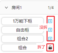 2)当前柜组的孔槽无冲突遮挡问题后,即可点击柜组后面的图标,进行拆单数据的保存,柜组保存后,柜组后的图标会变为小锁的图标: