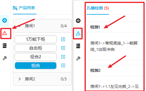• 有孔槽冲突、遮挡时,孔槽检测图标会亮显为红色图标,需注意根据检测结果进行孔槽数据的优化,确保孔槽数据无冲突和遮挡;