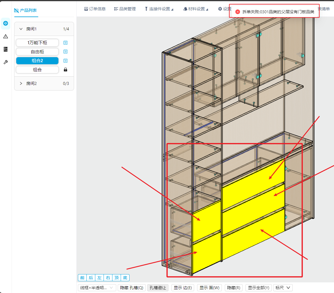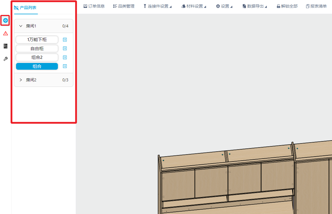 1、豪易拆左侧栏的产品列表,会将订单方案中所有柜体单元/柜组都挪列出来: