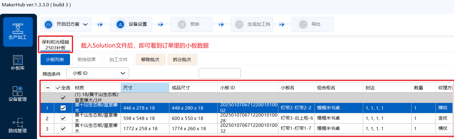 2)在载入Solution文件后,即可看到旧方案里的小板数据: