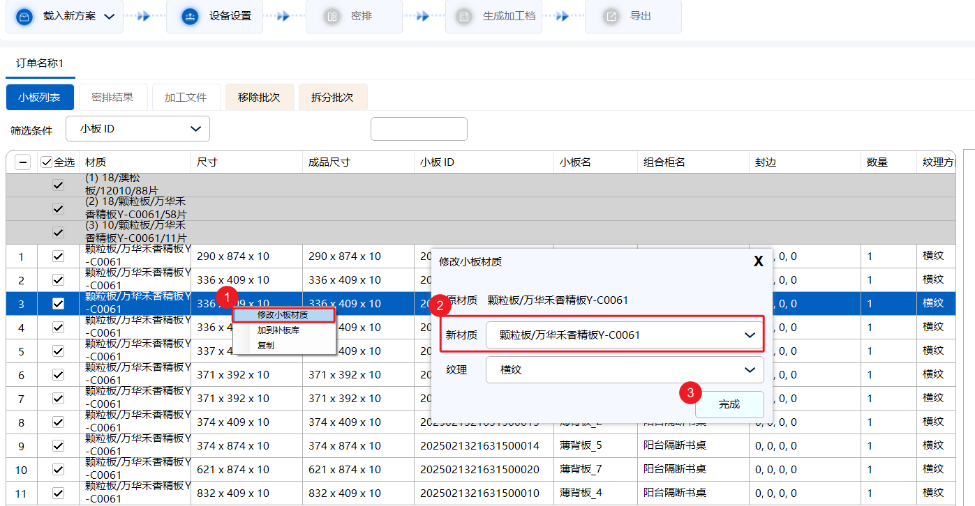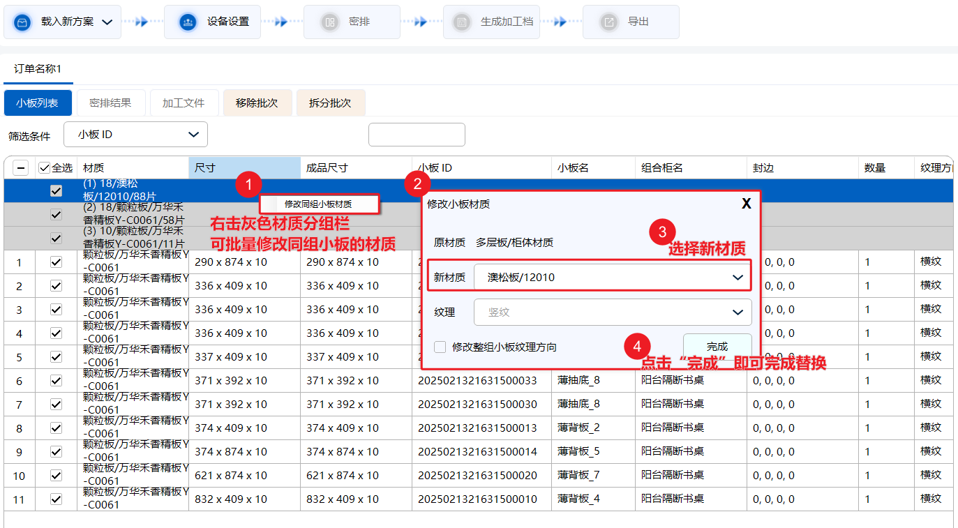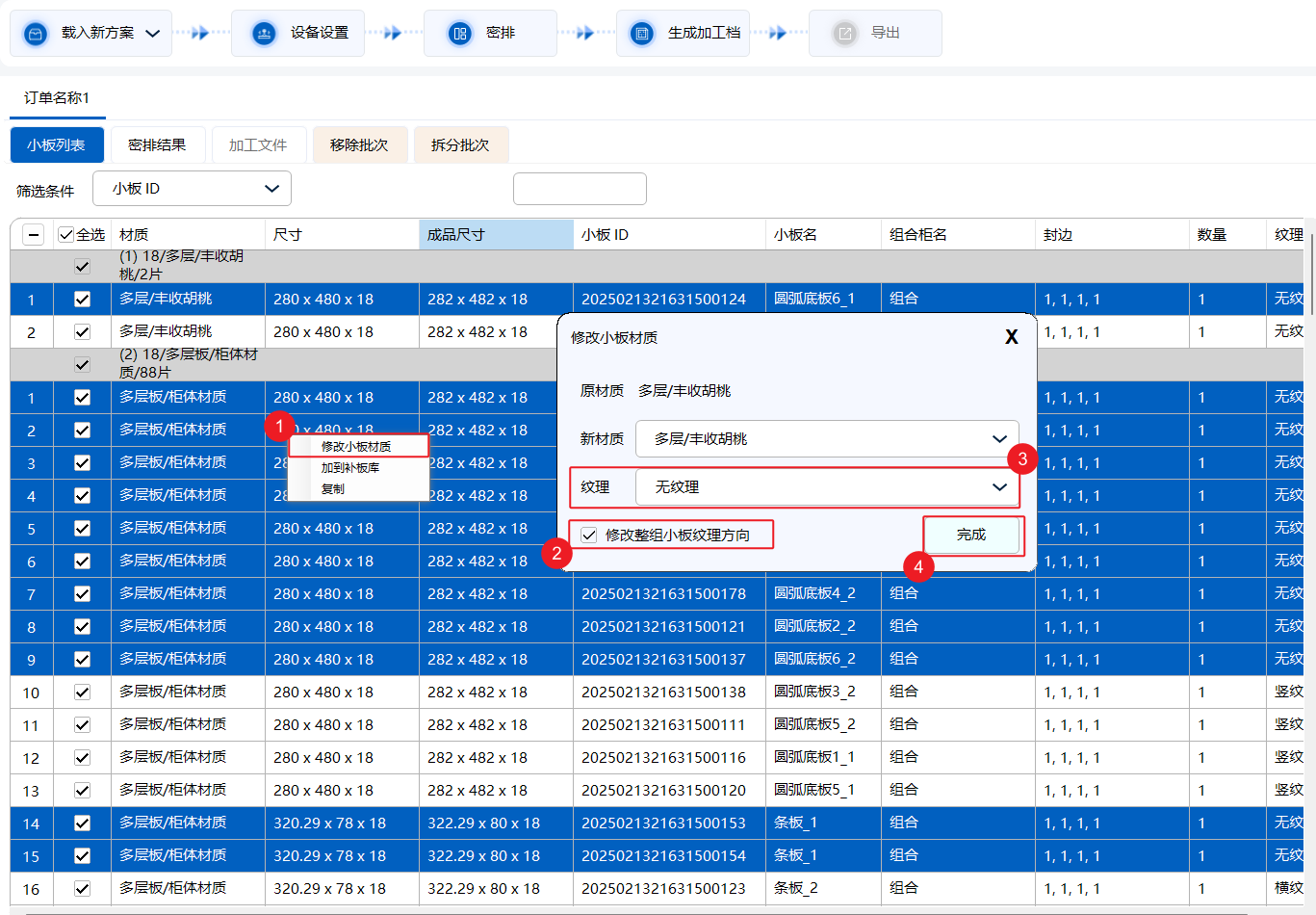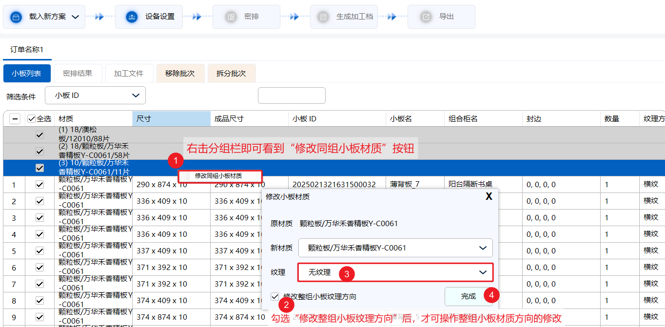 需注意的是:修改同组小板材质时,注意不要勾选“修改整组小板纹理方向”,否则会导致有纹理的板件密排生产出错,(一般需要将有纹理板件设置为无纹理,才需要勾选此选项)