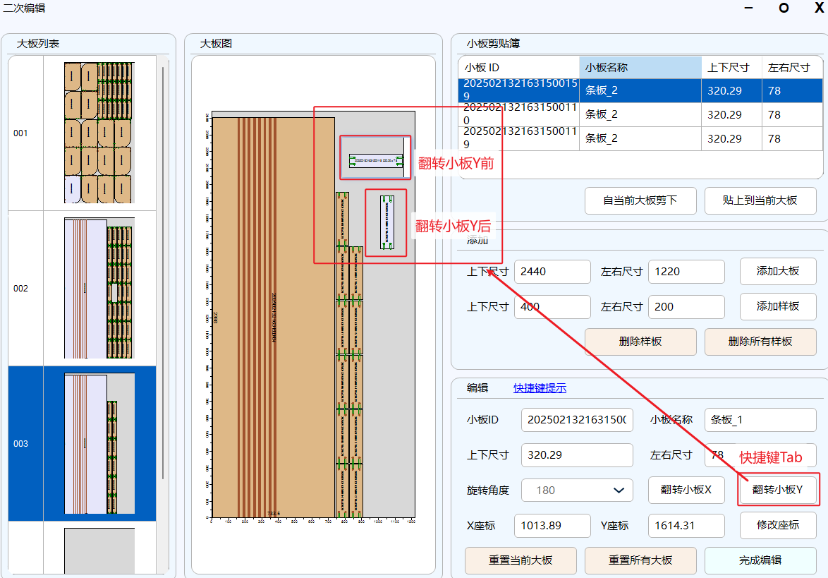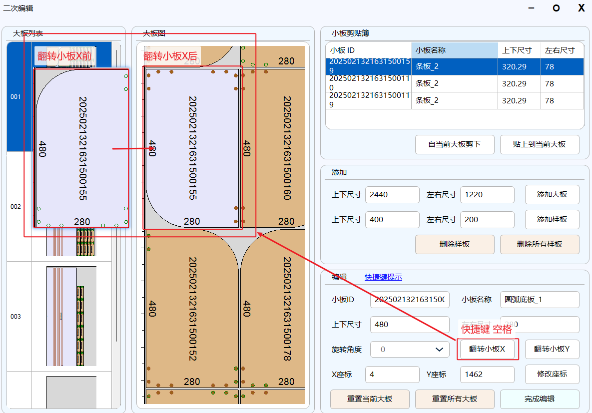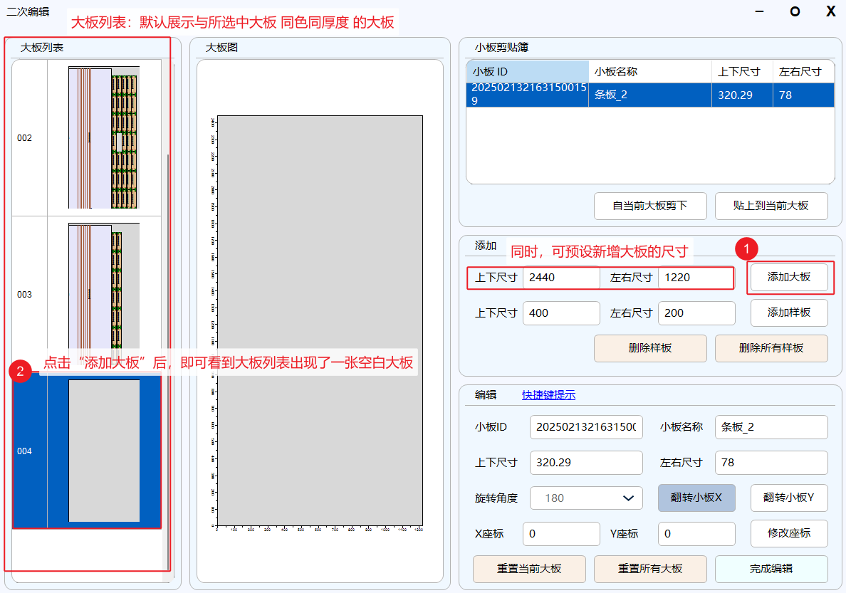 ①可单独添加一块新的大板,用于放置被剪下的小板;若新增的大板上没有小板数据,则会在点击“完成编辑”后自动被清掉;