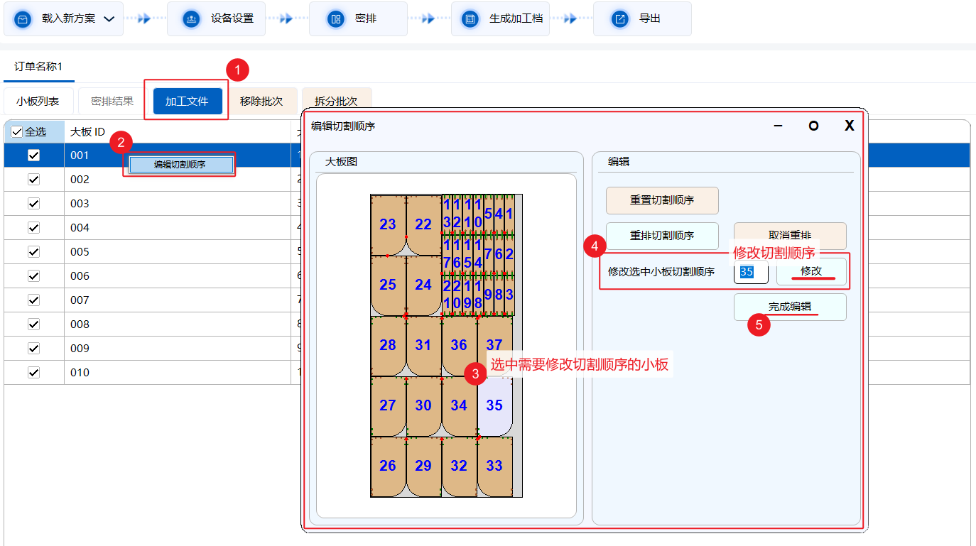 选中需要编辑切割顺序的大板,右击点“编辑切割顺序”后,选中需要修改切割顺序的小板,进行单块小板的切割顺序调整: