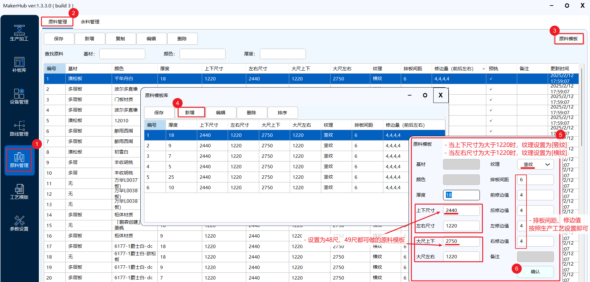 1)新增原料时,原料的 厚度、纹理、排板间距、上下尺寸、左右尺寸、大尺上下、大尺左右、上下左右修边值 会自动取“原料模板库”里的编号1的数据作为模板展示;