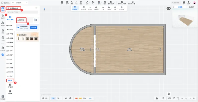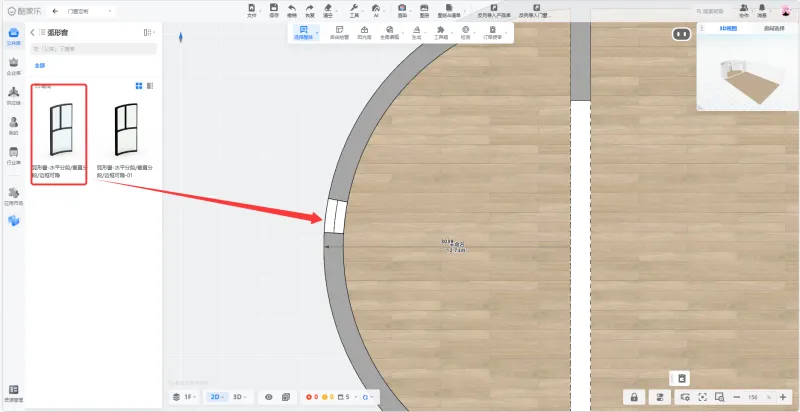 进入门窗定制工具页面,在“定制默认公库”中可以直接选择“弧形窗”,然后选择所需素材放置目标墙体,并根据需要进行参数的调整