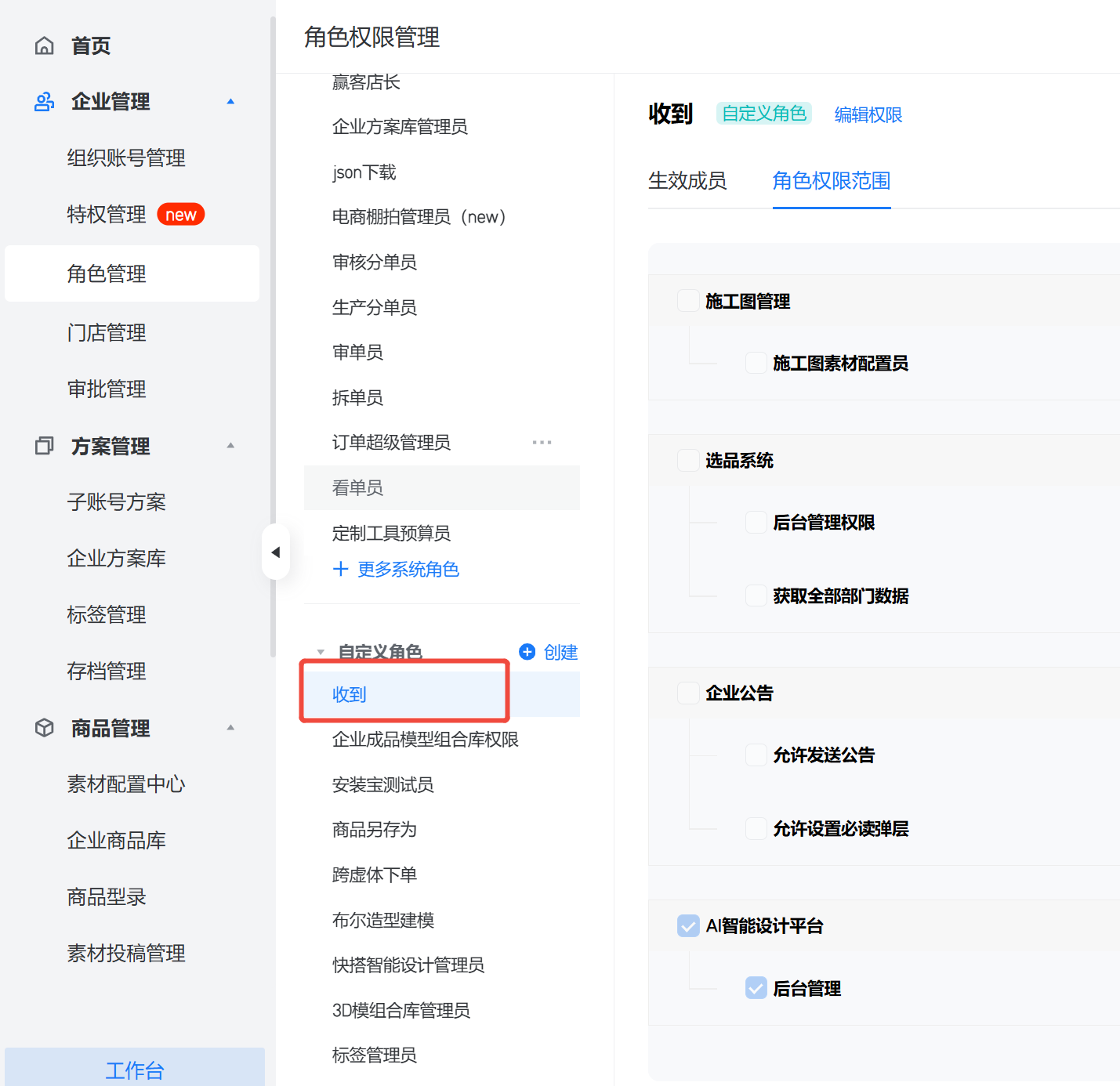 注意:设置管理员之前需要总帐号在商家后台——添加自定义角色——勾选AI智能设计后台管理的权限,并分配给对应管理员