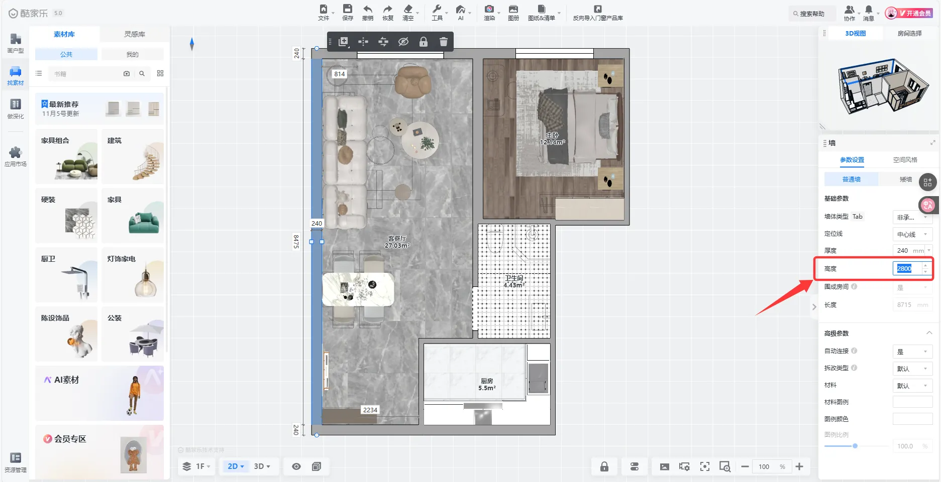 【户型设计】墙体高度支持直接在属性栏中修改,点击查看详情,了解使用方式