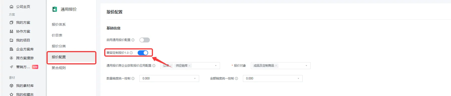 在通用报价的报价配置中,打开“兼容定制报价1.0”开关,启用后可以在工具前端使用时选择老版本的定制报价使用