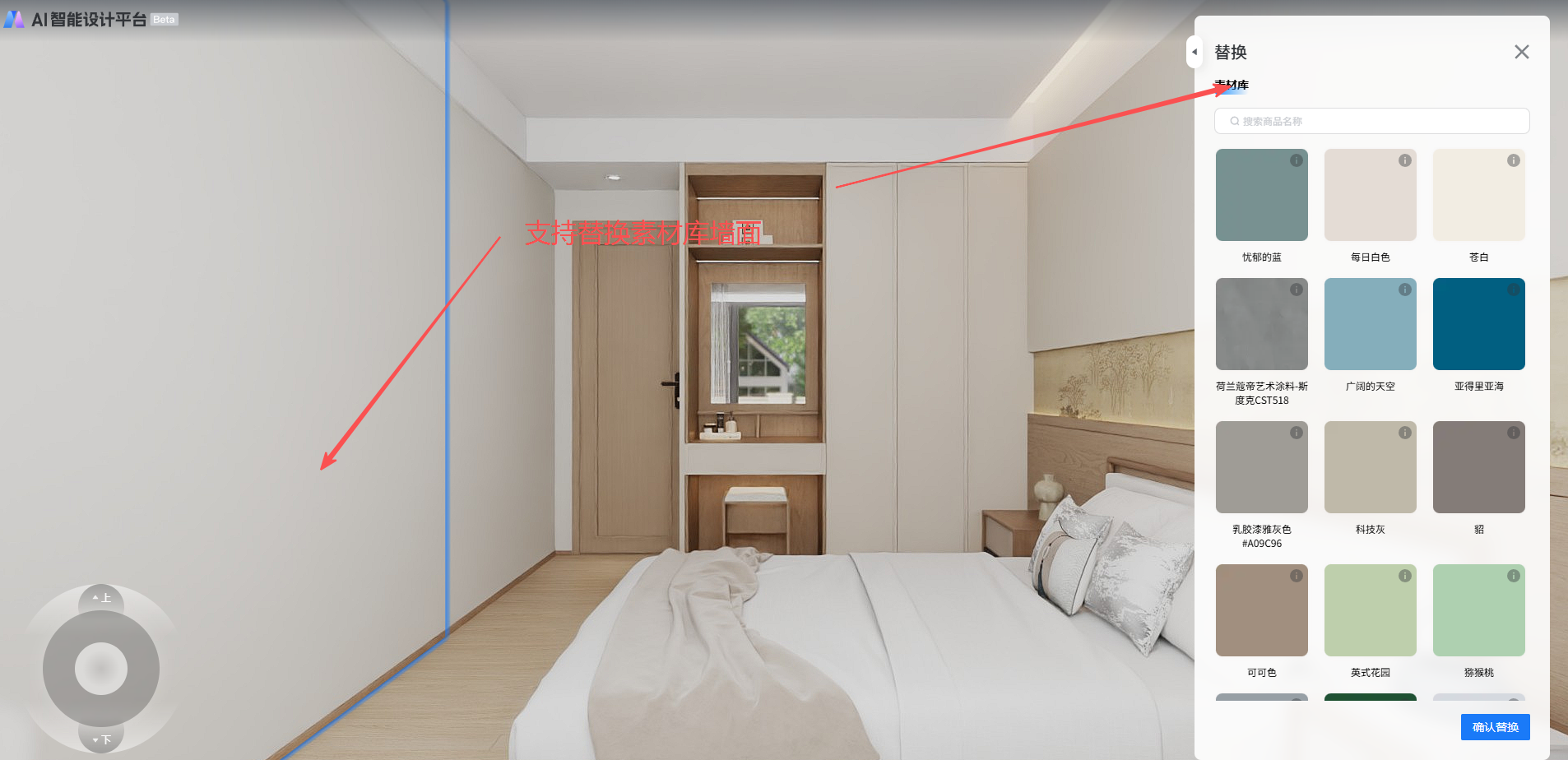 注意:支持替换替换素材库墙面,但是不支持换铺法