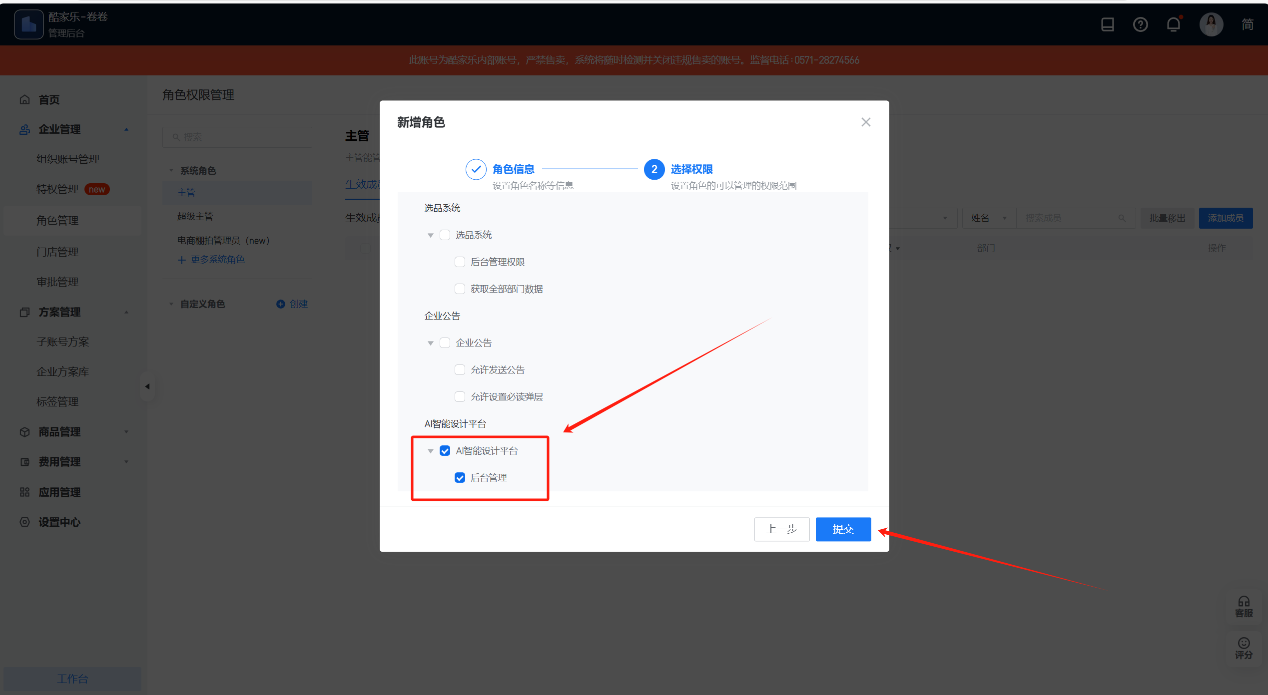 面向AI智能平台商家主账号 指导商家完成AI智能设计后台权限开通
