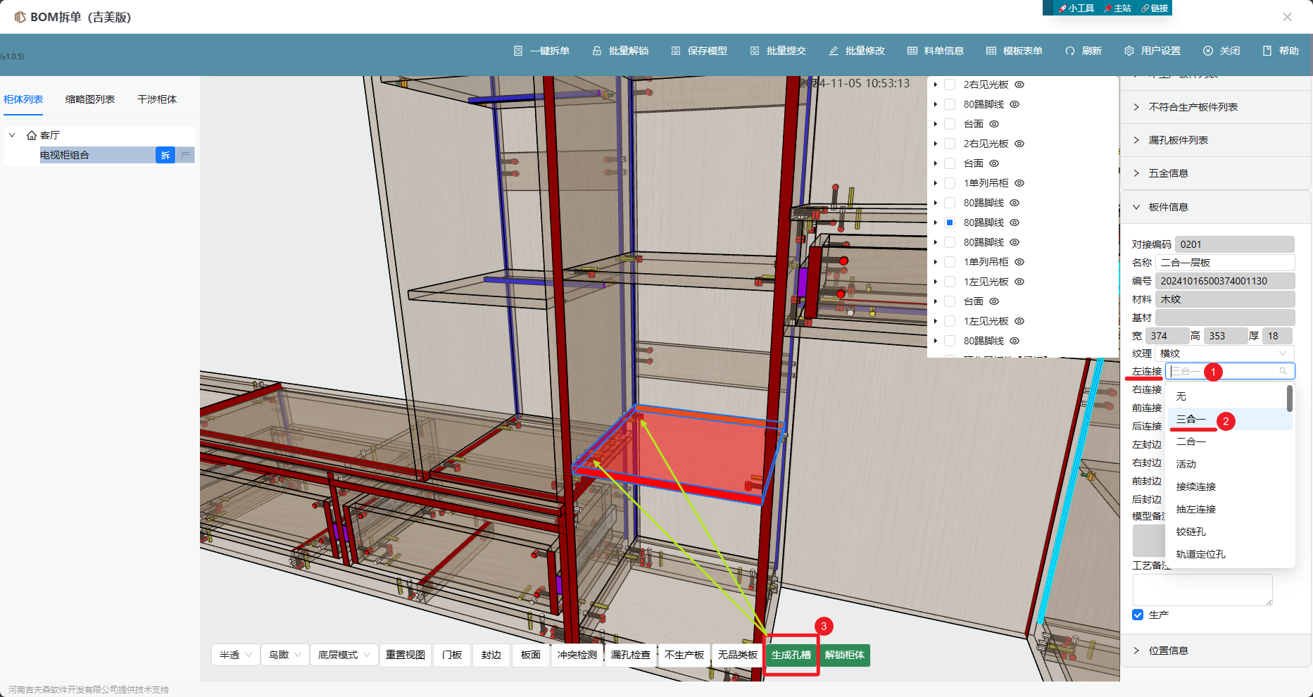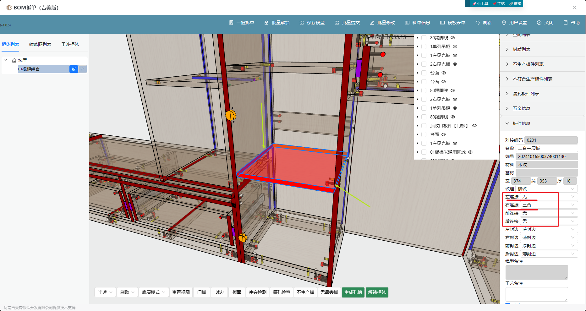 若 漏孔检查 亮显的边确实需要生成连接件,则可选中对应板件,进行上下前后连接方式的检查,再进行手动的连接方式选择,然后重新点“生成孔槽”给板件加上连接五金:
