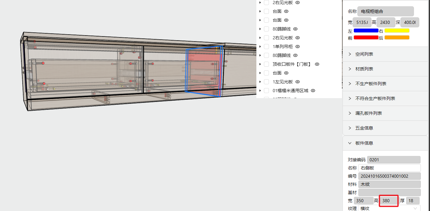 检查板件自身尺寸与同内空宽/深的其他板件尺寸是否一致;如下图所示:同内空板件的宽度值不一致,可判断板件宽度尺寸错误,导致与左侧板有1mm缝隙,不符合生孔条件,故左侧没有生成孔位;