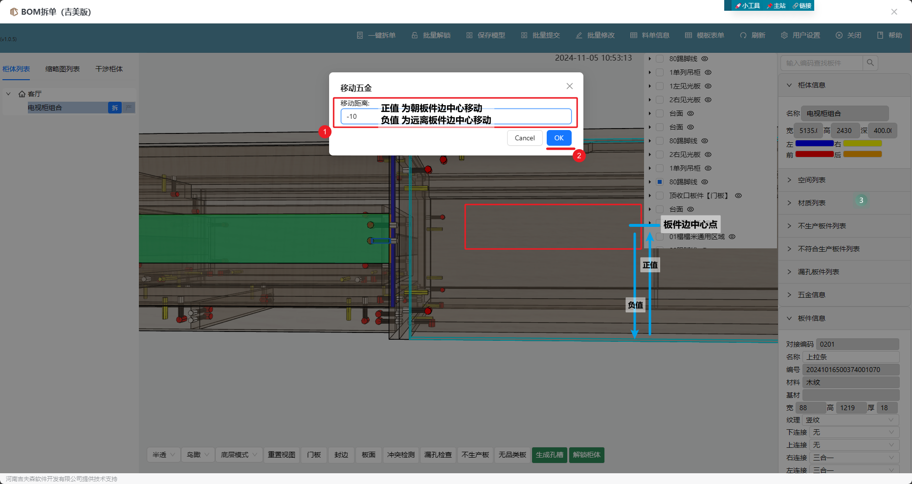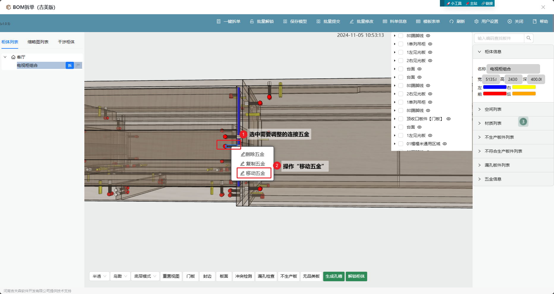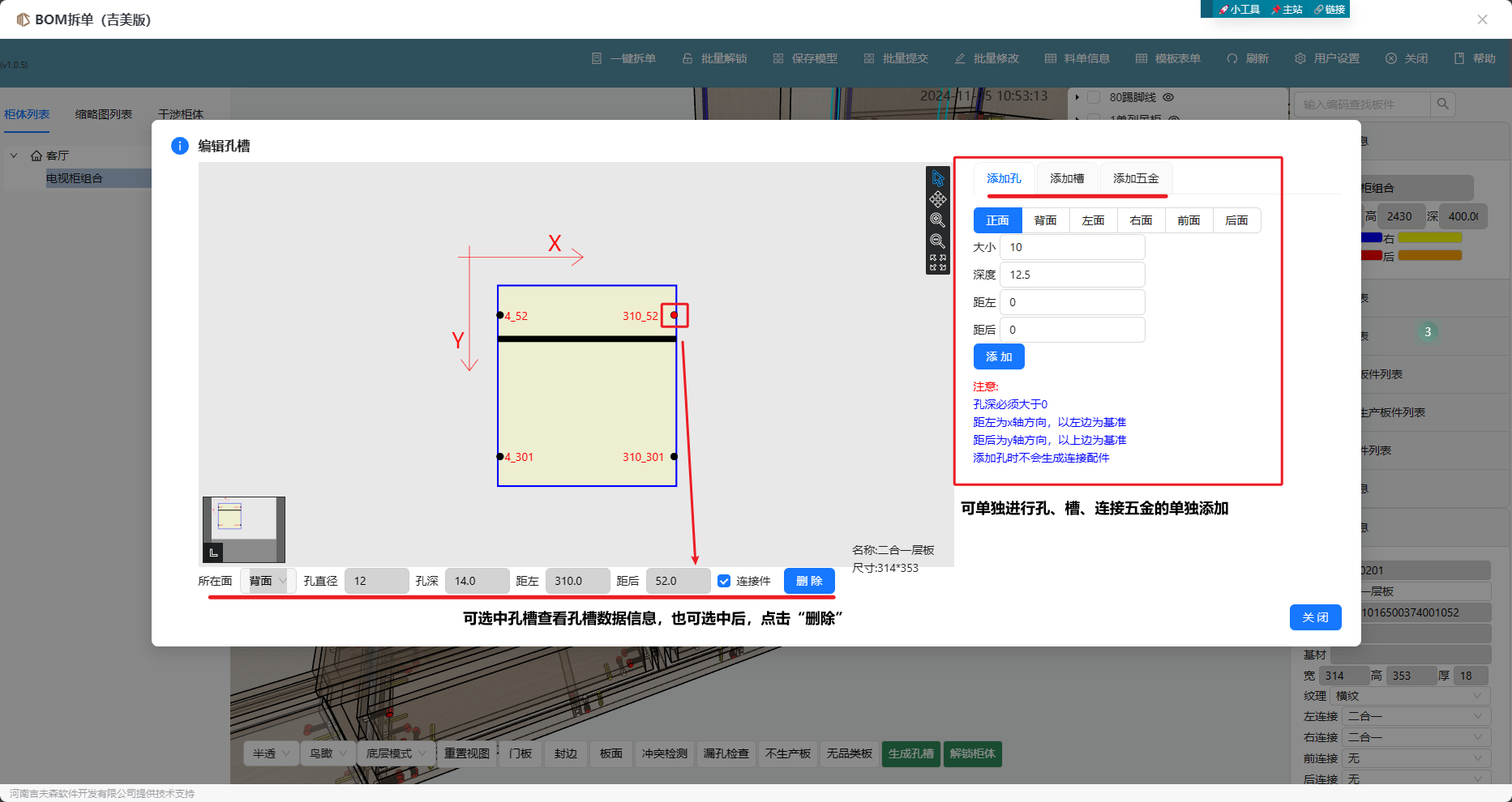 当连接方式合理的情况下,仍有孔槽冲突时,则需选中连接五金,进行连接五金的单独调整:删除/移动