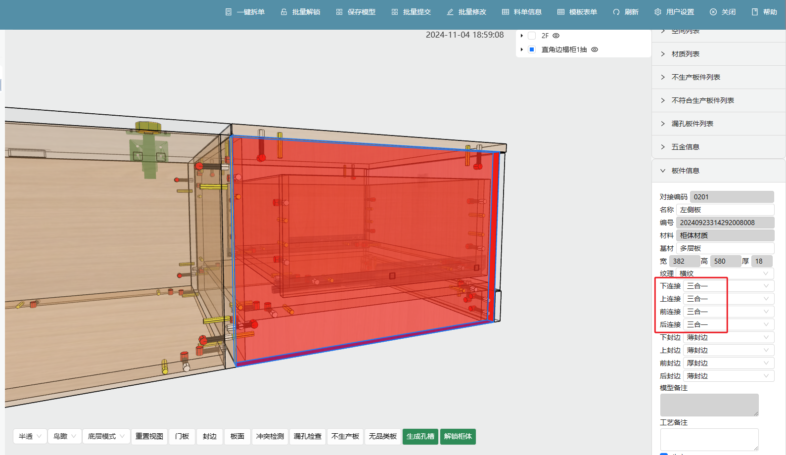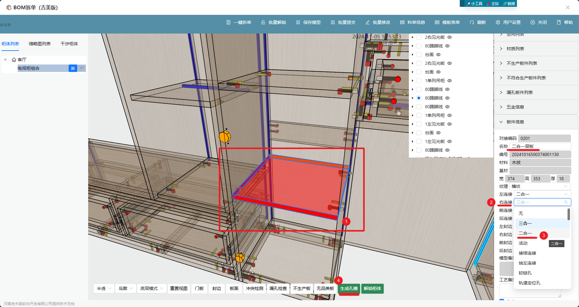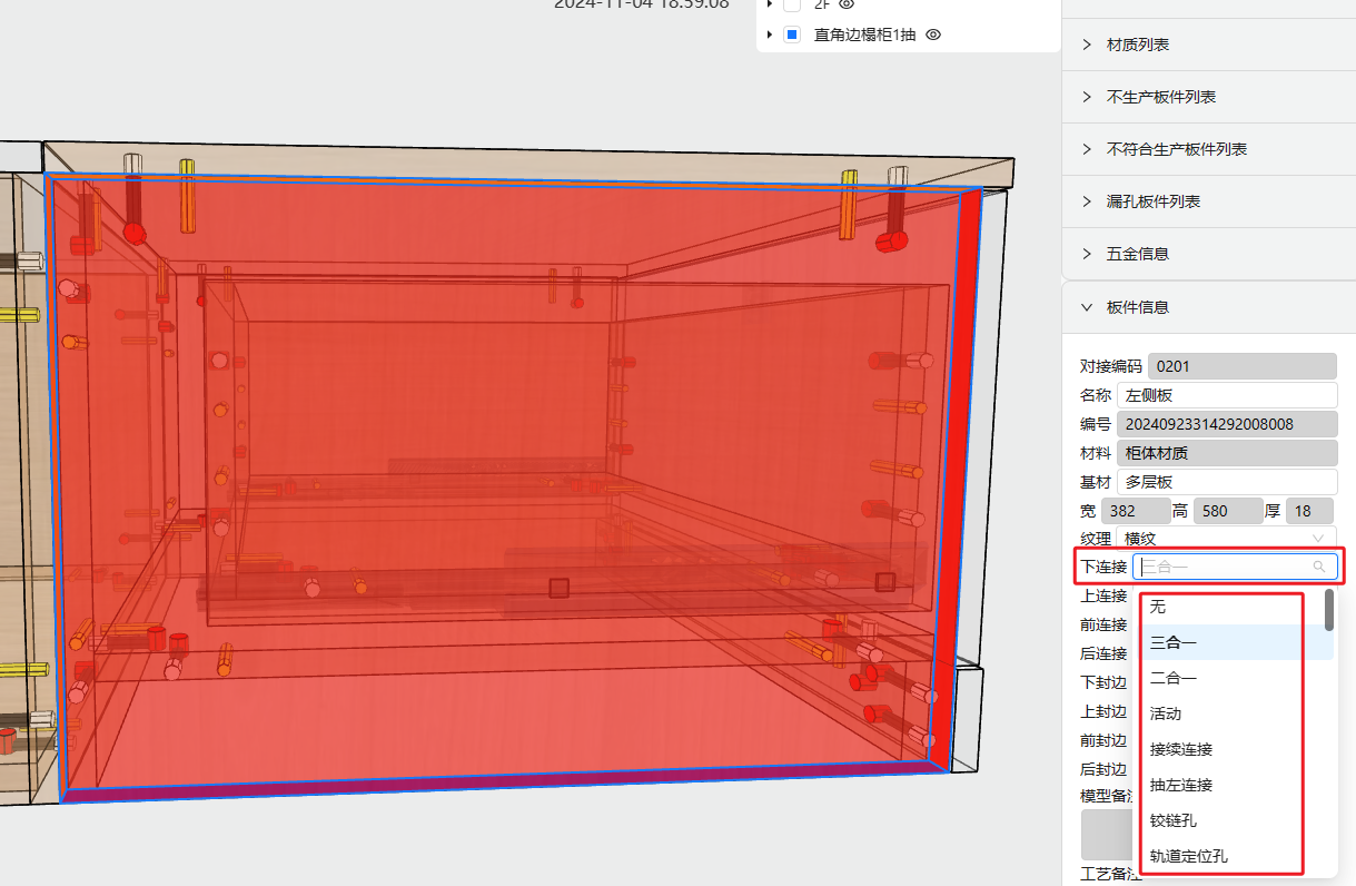 如:应该是活动的连接件但错选成了固定的连接件(需和设计师核对好),可选中需调整的板件,手动调整连接方式后重新点“生成孔槽”: