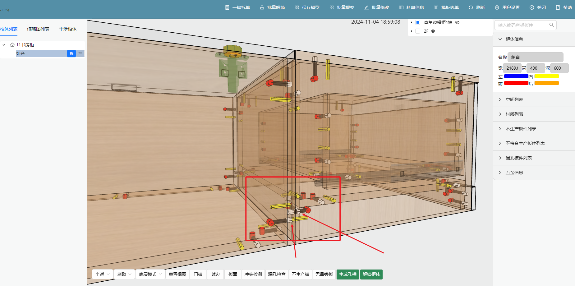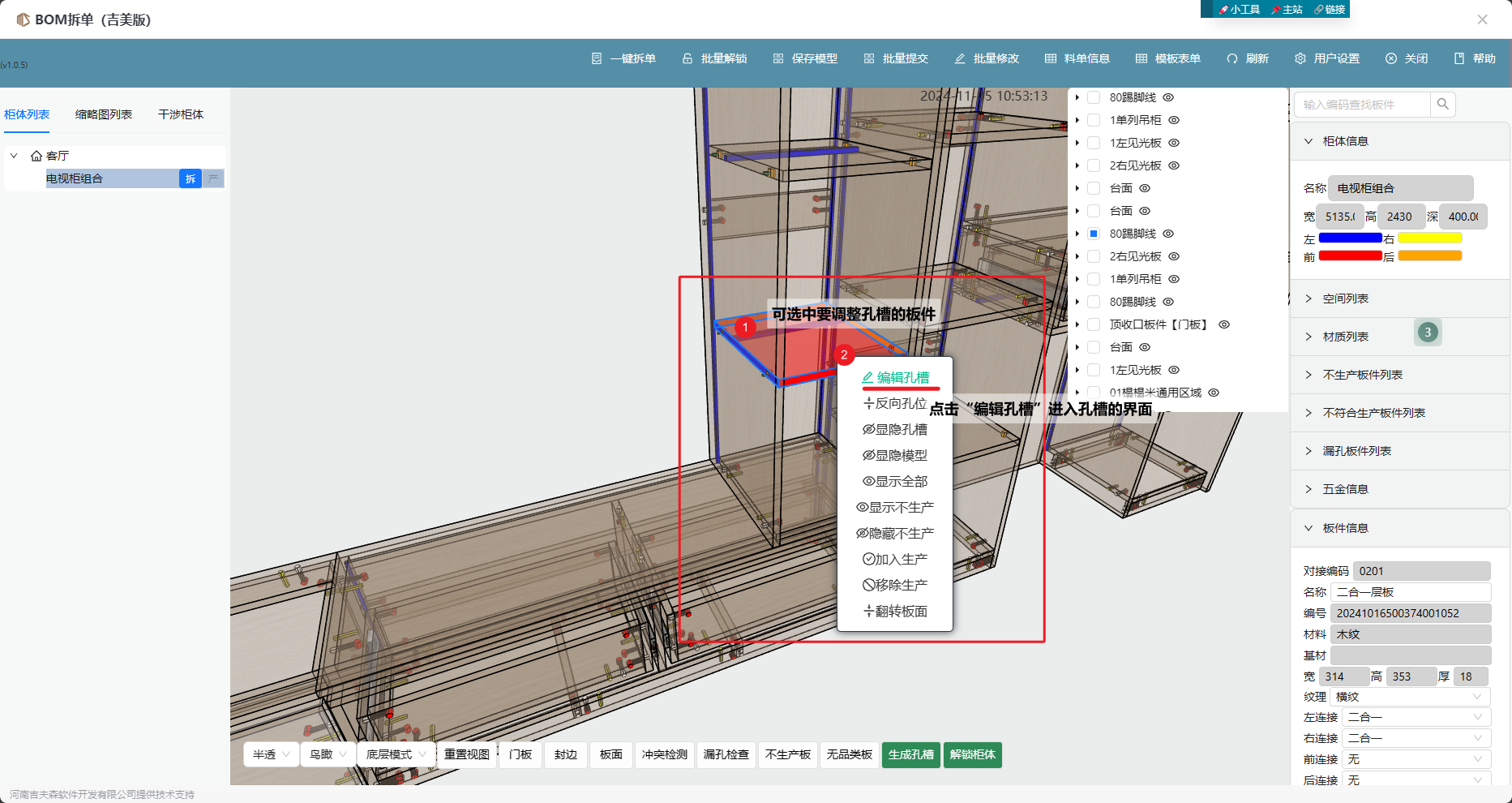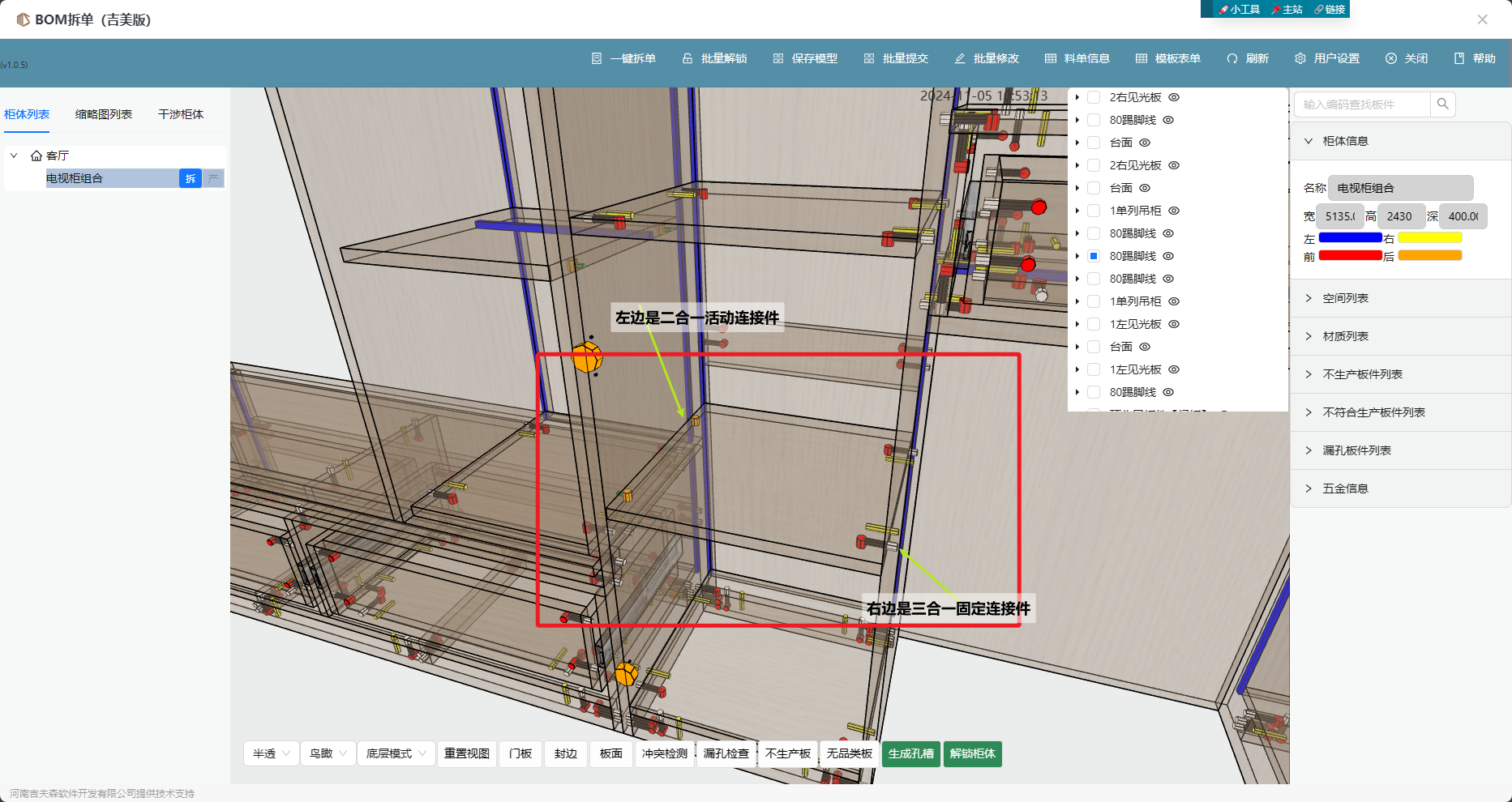 如:应该是活动的连接件但错选成了固定的连接件(需和设计师核对好),可选中需调整的板件,手动调整连接方式后重新点“生成孔槽”:
