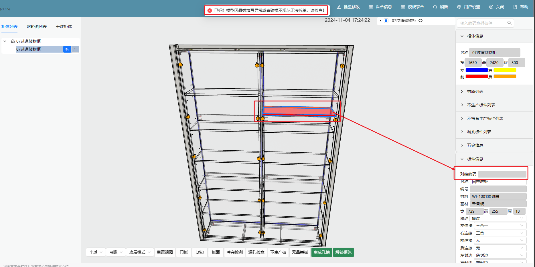 - 进入BOM拆单,点击【生成孔槽】后,有板件爆红并提示 “已标红模型因品类填写异常或者建模不规范无法拆单,请检查!” 时,则需要注意检查爆红板件是否没有品类编码(即对接编码),没有品类编码的板件无法正常失生成孔槽,也无法生成板件数据,无法下发生产;