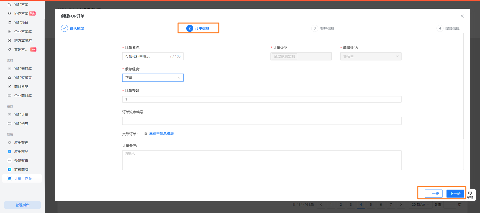 点击“下一步”后,规范填写订单名称、紧急程度后确认客户信息即可完成补单的创建;