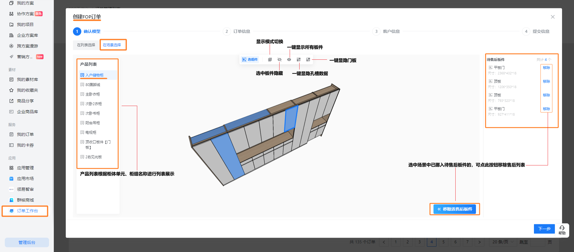 选中板件点击 “添加为售后板件” 后,待补板件会罗列在待售后板件列表里,若有选错的板件,可点击移除;