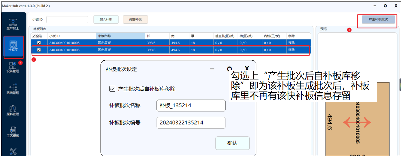 D)生成补板批次后,即可将需要补的板件,进行优化排版并生成生产数据