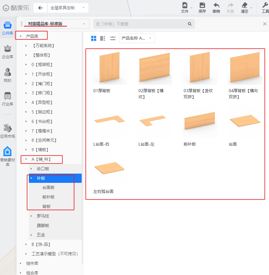 当然如果需增加单独的横/竖板,可直接拖出产品库-A【辅料】-补板里的板件用于提审下单;