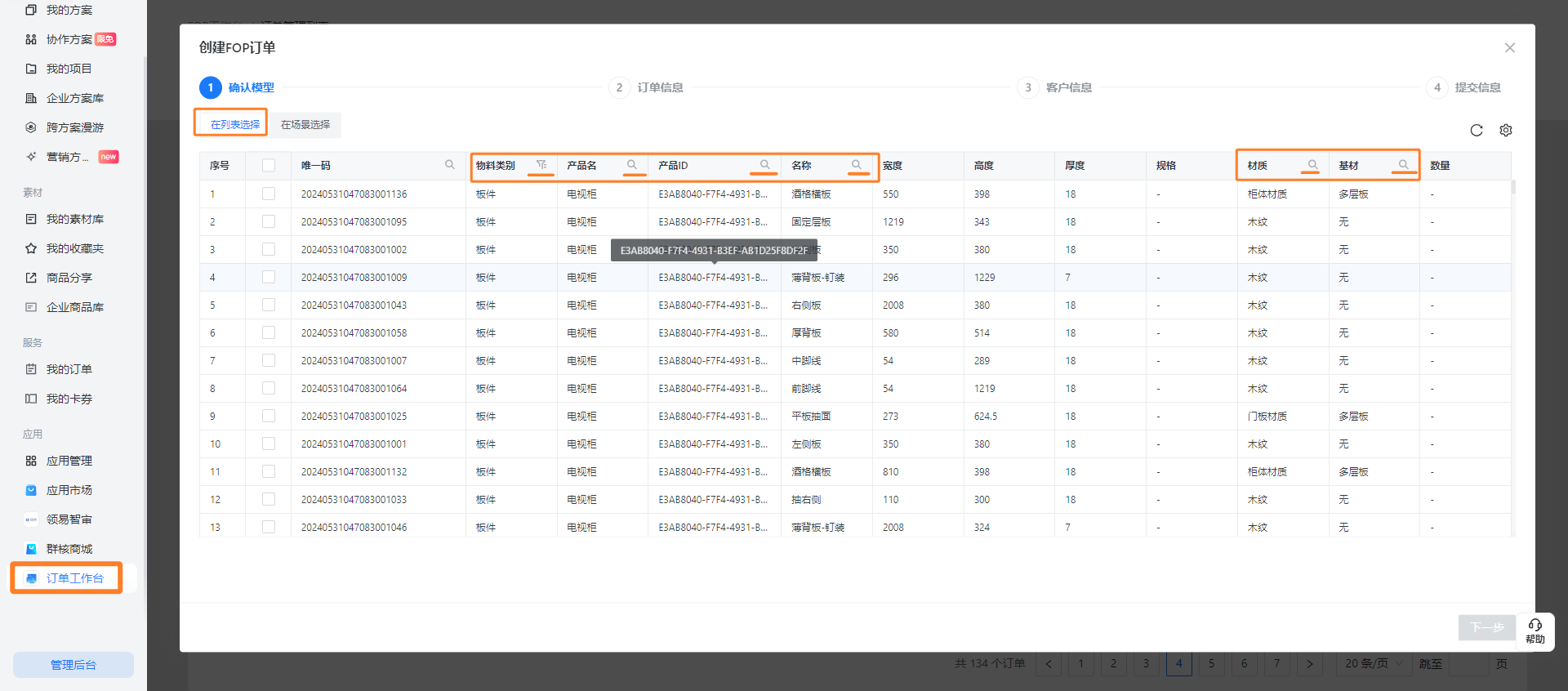 A)可通过【在列表选择】根据板件ID或者尺寸、材质筛选,选择需要做改补的板件: