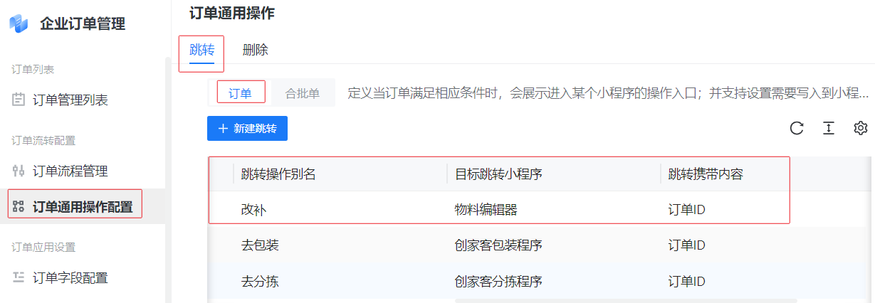 需注意:需企业主账号在“订单通用操作配置”里配置“物料编辑器”小程序跳转的操作按钮