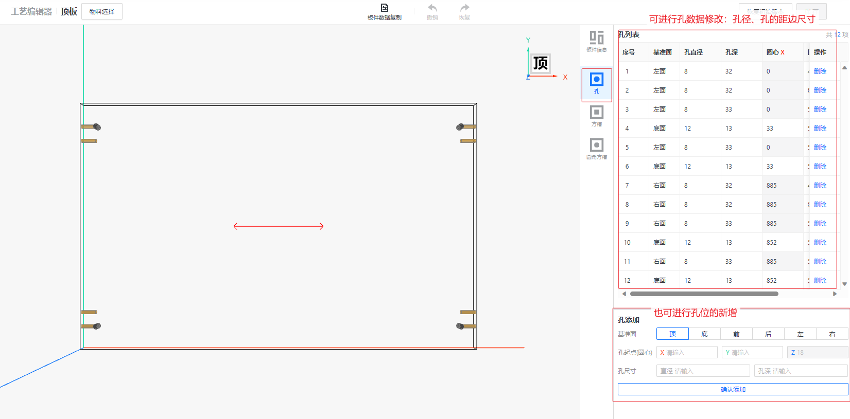 可点击“孔”栏,进行孔位信息查看、修改、删除或新增