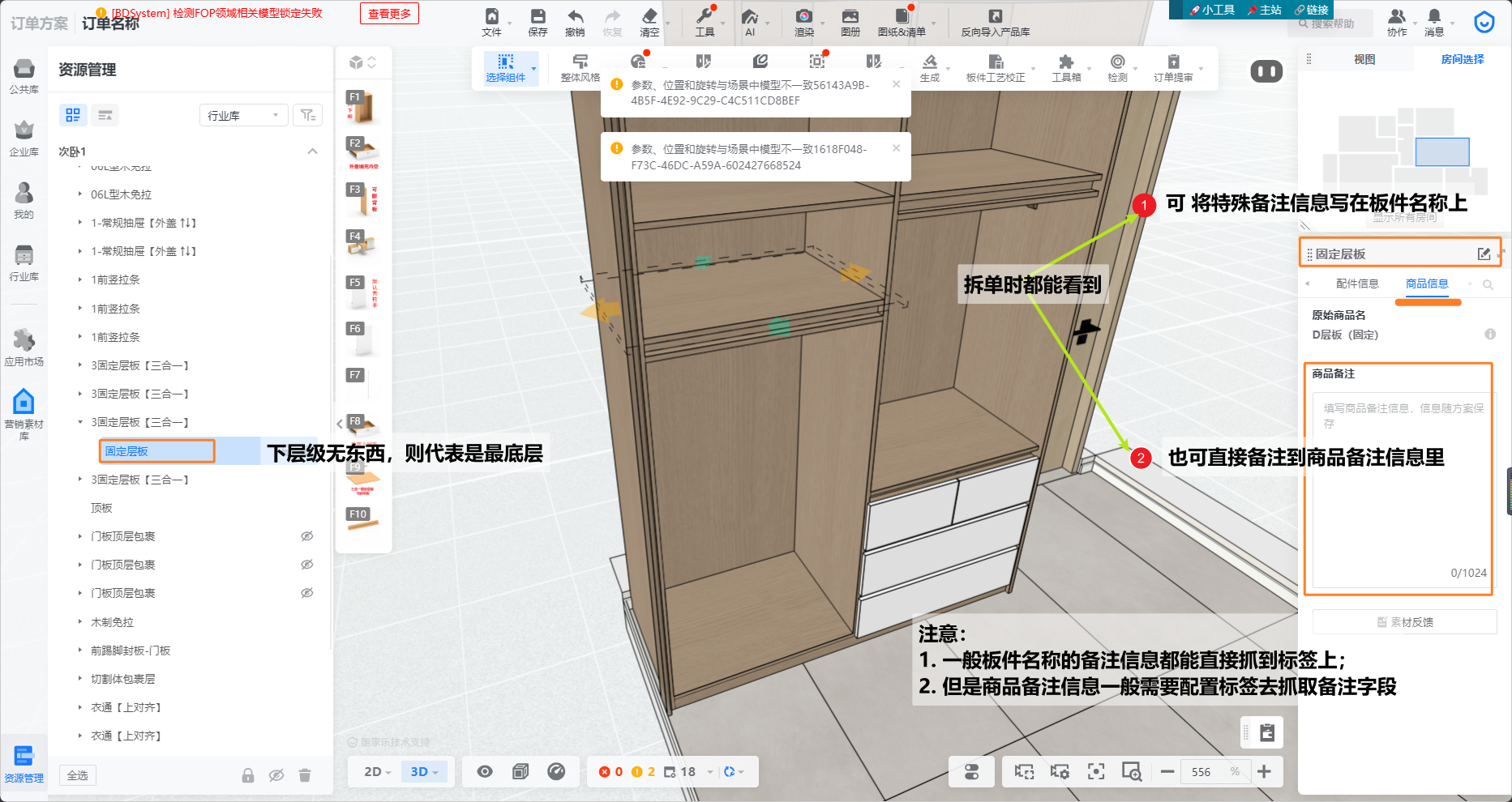 - 特殊备注加工的信息,可备注到最底层板件的【名称】或者最底层板件的【商品信息-商品备注栏】里