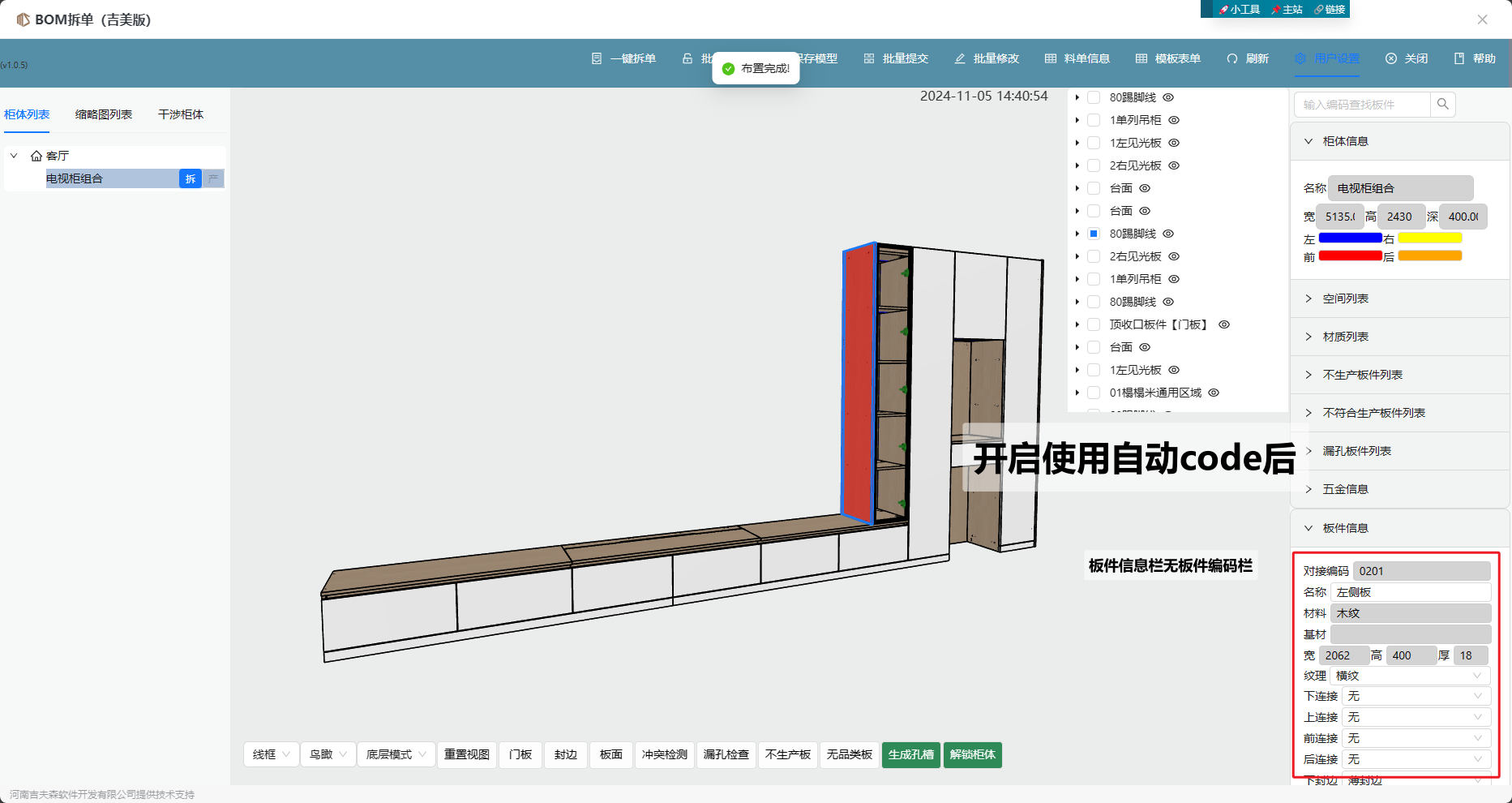 方式2:开启使用自动code(但有弊端:拆单保存后,再选中板件无法查看到板件的板件编码)
