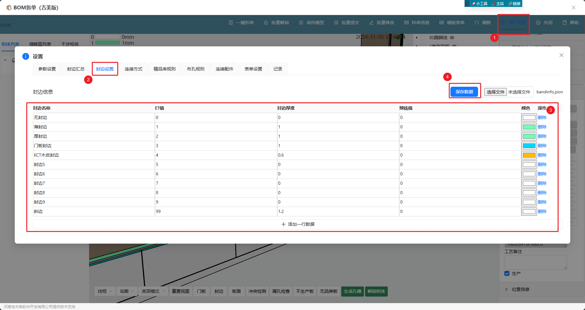 若有封边配置不符合当前生产需求,则需调整封边设置,调整后保存数据,并重新进入bom拆单,即使用最新的封边配置;