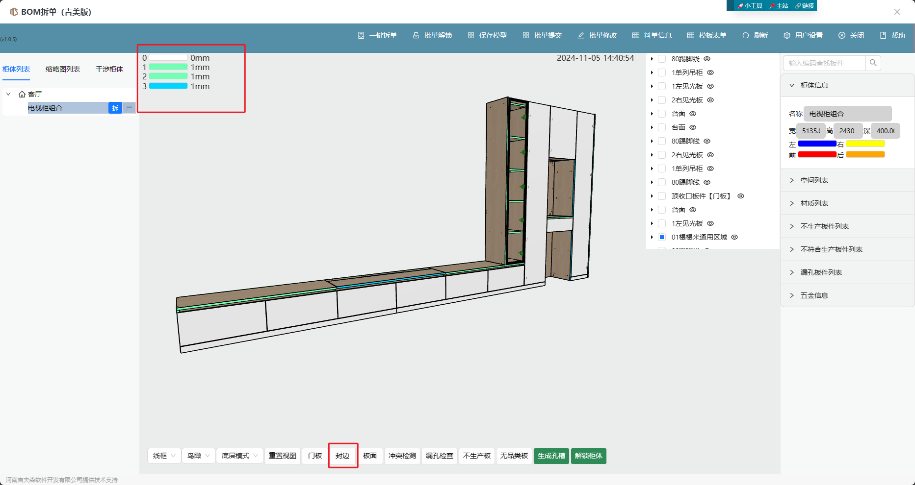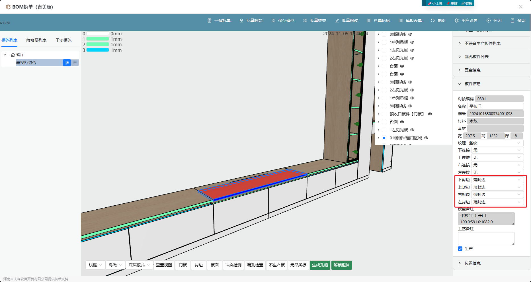 若板件四周封边值有区分三薄一厚,则需要通过bom拆单里的“封边”按钮,进行封边信息的检查;