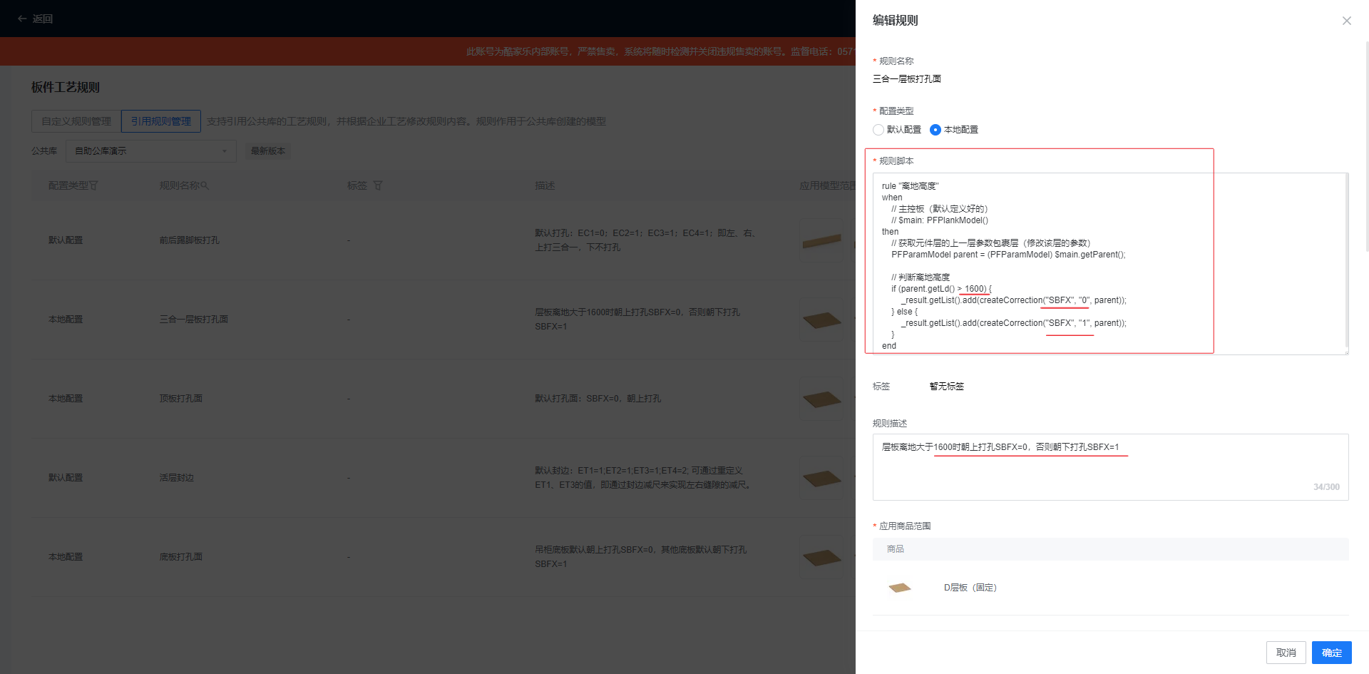 上述的大饼孔朝向规则,可通过板件工艺规则进行自定义配置: